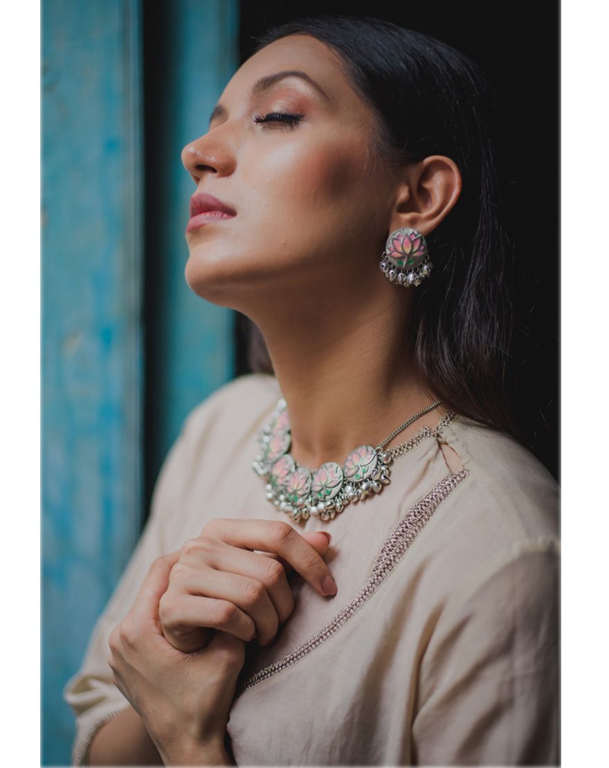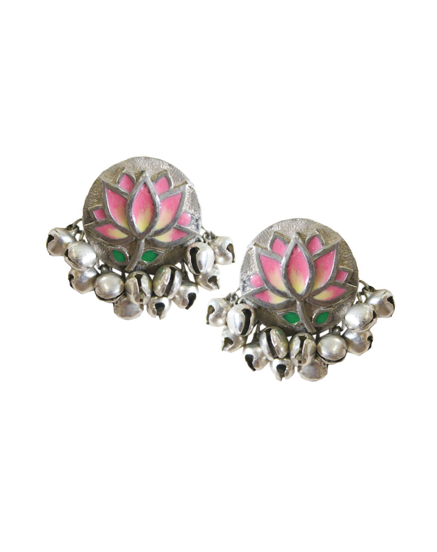 Pink Lotus Silver Studs : Handcrafted silver studs inspired from “Pichwai” motifs with handpainted enamel.