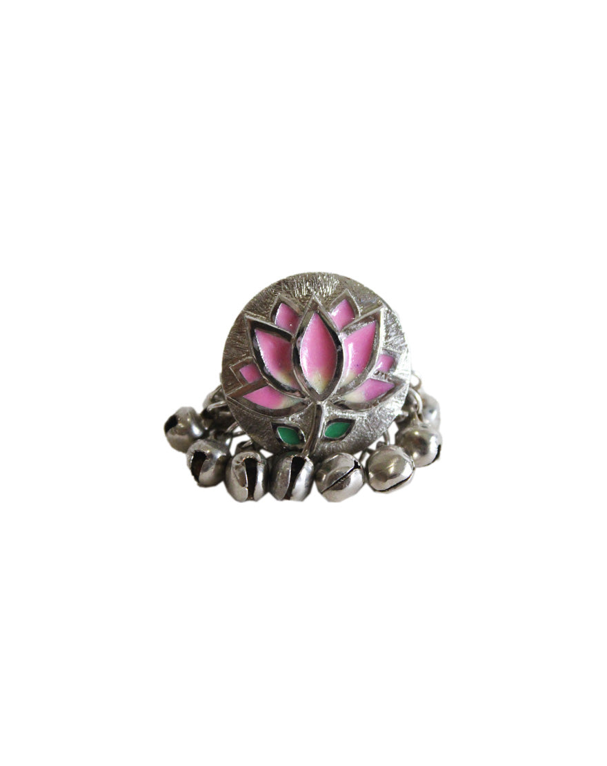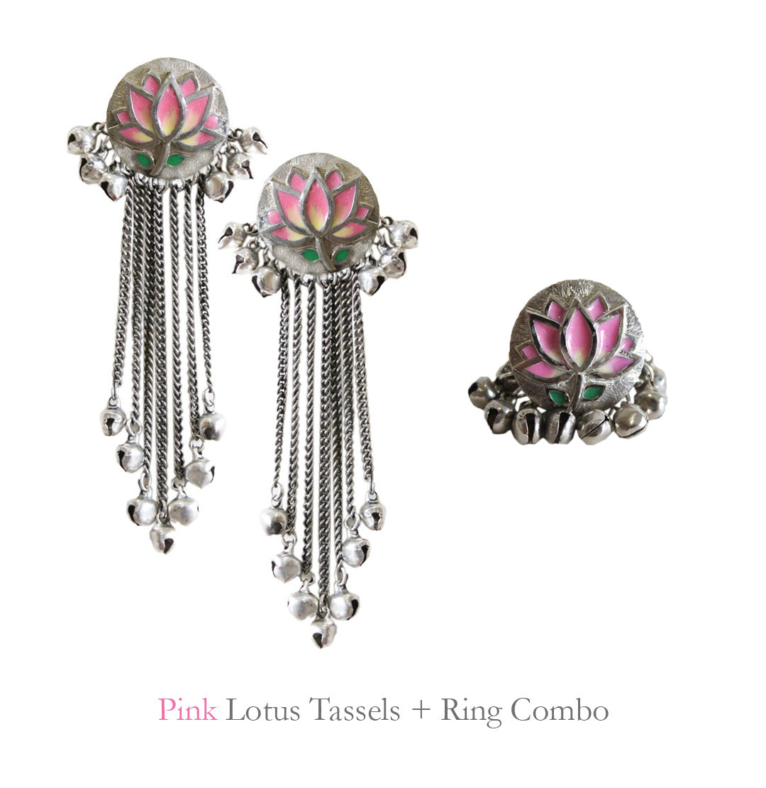 Pink Lotus Tassels and ring combo : Handcrafted silver tassel earrings inspired from “Pichwai” motifs with hand-painted enamel and pink lotus ring buy as a combo and get at discounted price.