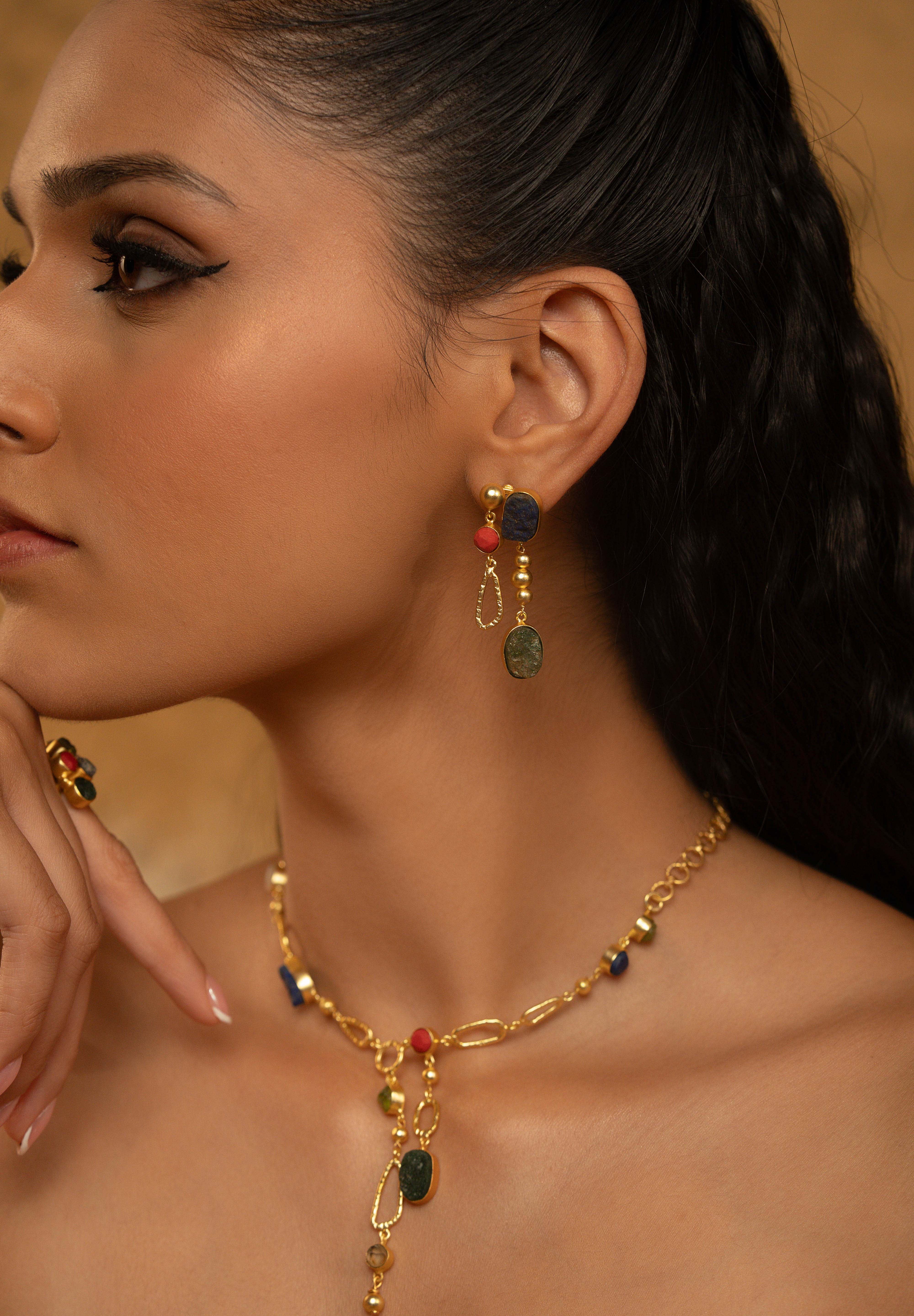 Vivid and architectural, the Saara Earrings draw inspiration from the color harmony of Egyptian artistry. Handcrafted in 16K gold-plated recycled brass with a satin matte finish and anti-tarnish coating, each pair features a medley of natural gemstones — lapis lazuli, coral, peridot, citrine, crystal, and green onyx — framed in uneven, hand-textured brass forms. Finished with sterling silver posts for comfort and durability, they are statement-makers that balance color, texture, and timeless design.
