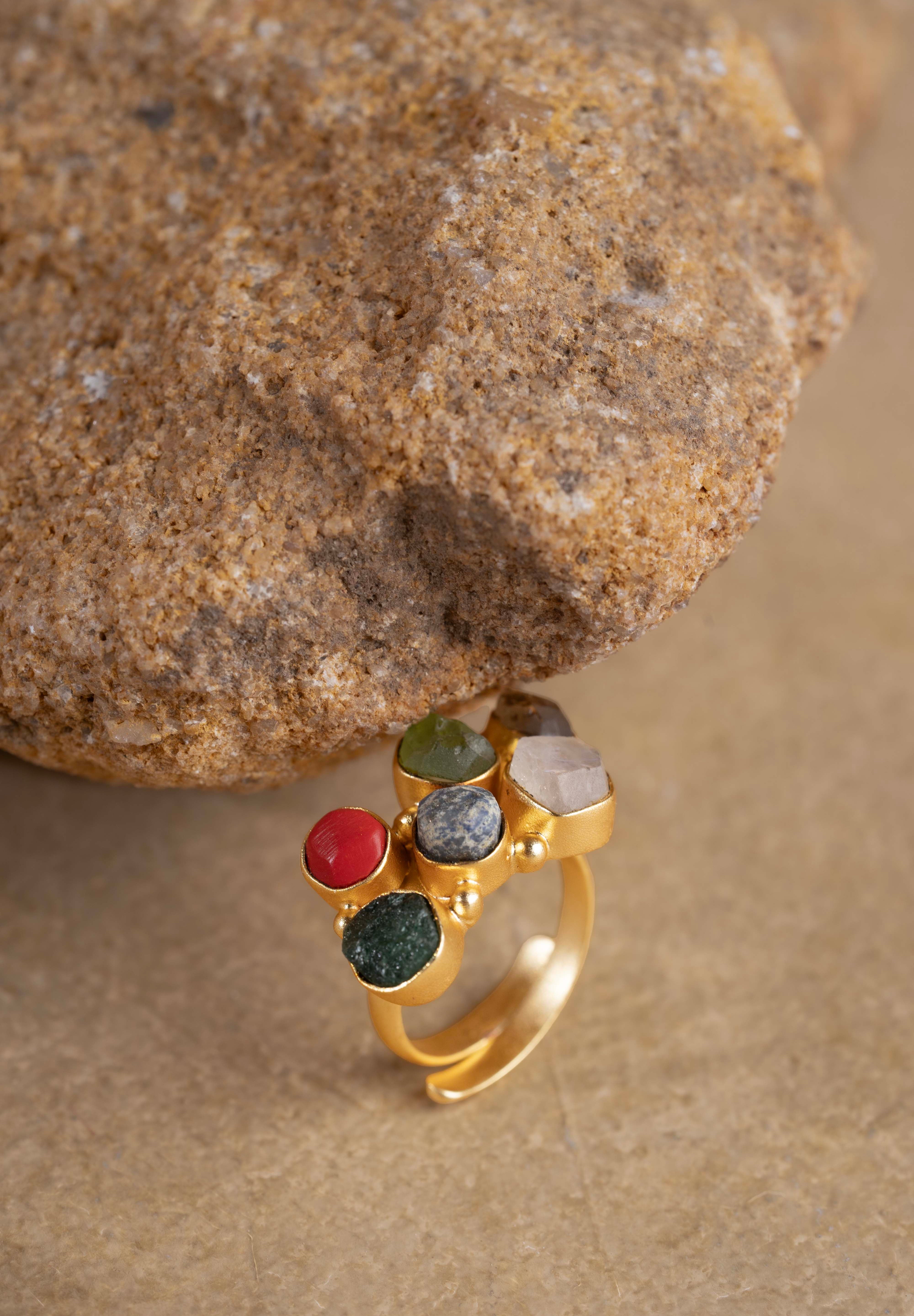 A kaleidoscope of color and craftsmanship, the Saara Ring brings together a cluster of natural gemstones — lapis lazuli, coral, peridot, citrine, crystal, and green onyx — accentuated with delicate gold bead detailing. Handcrafted in 16K gold-plated recycled brass with a satin matte finish and anti-tarnish coating, it features an adjustable band for a comfortable fit. A modern statement inspired by the vibrant palettes of Egyptian art and ornamentation.