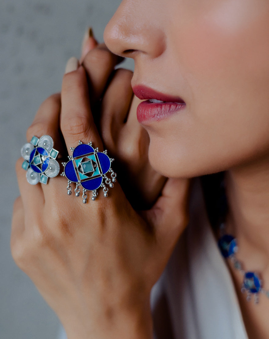 Sabrina Enamel Ring – Blue – This ring inspired from the architectural patterns found in the city of Marrakech (Morocco) handcrafted using silver plated brass with Sky blue and lapiz blue enamel and aqua chalcedony stones.