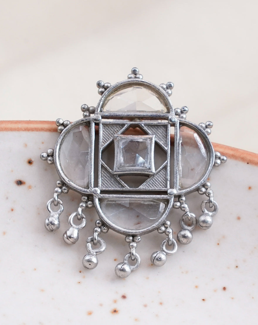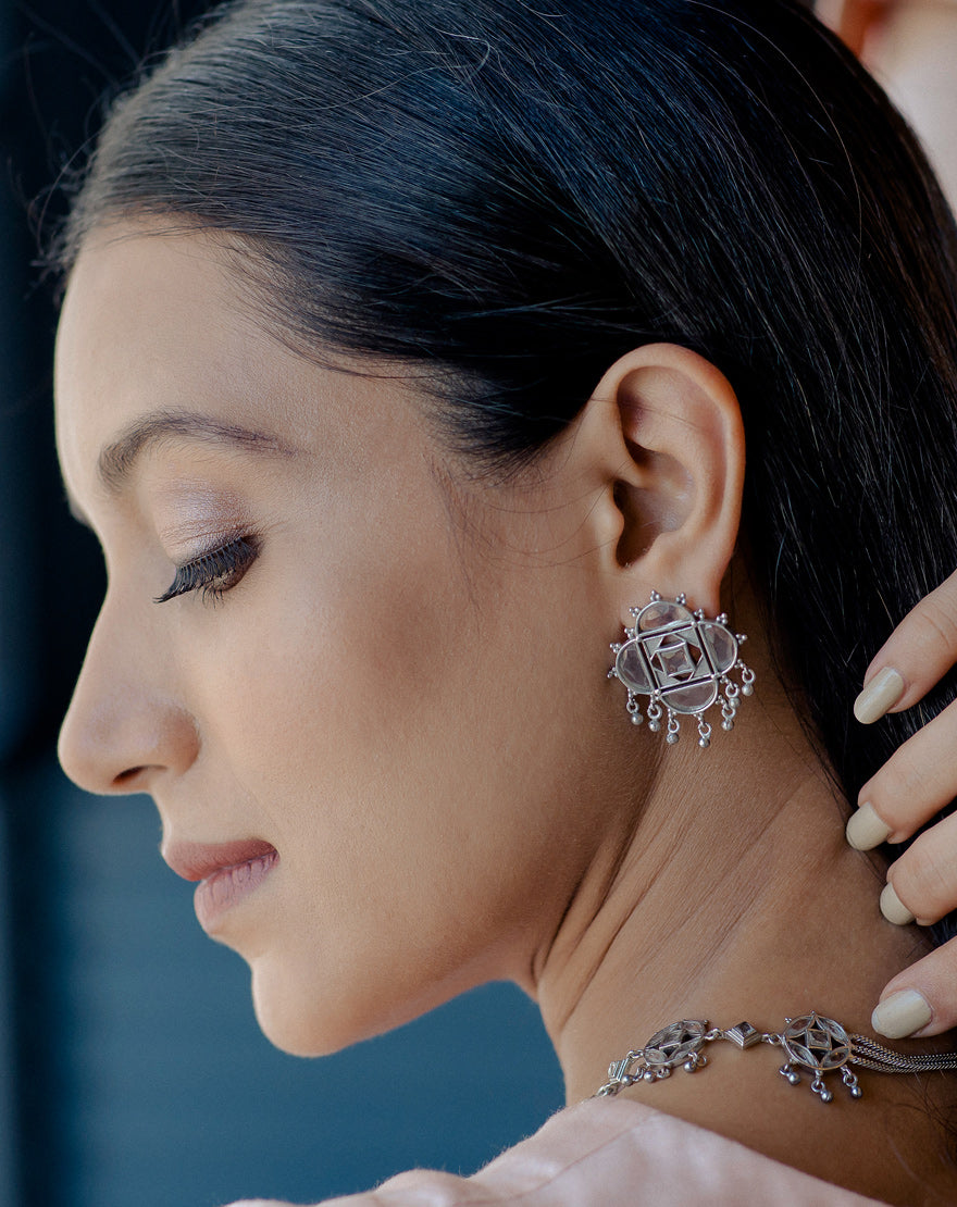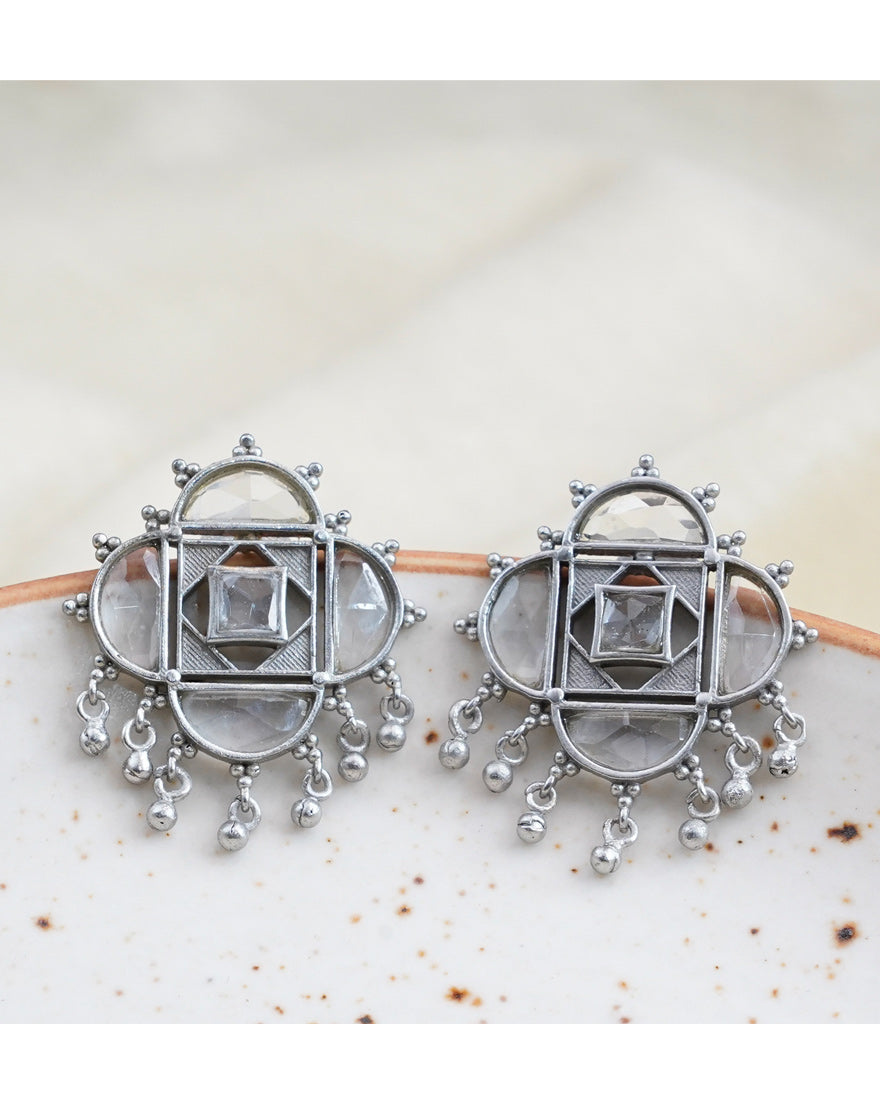 Sabrina Studs Clear Quartz – These stunning pair of earrings are inspired from the architectural patterns found in the city of Marrakech (Morocco) handcrafted using silver plated brass with Clear Quartz stones. These earrings are feather light in weight and a perfect pair of Indian Contemporary style.
