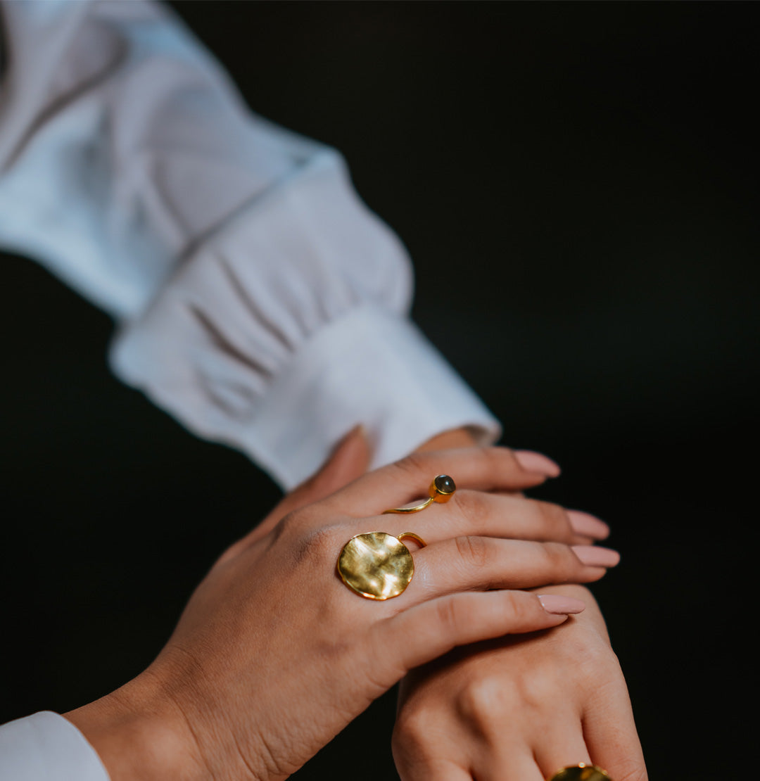 Saiya Ring Labradorite - Handcrafted statement making ring made using gold plated brass and beautiful semi precious Labradorite Stone. From our limited collection ECHO.
