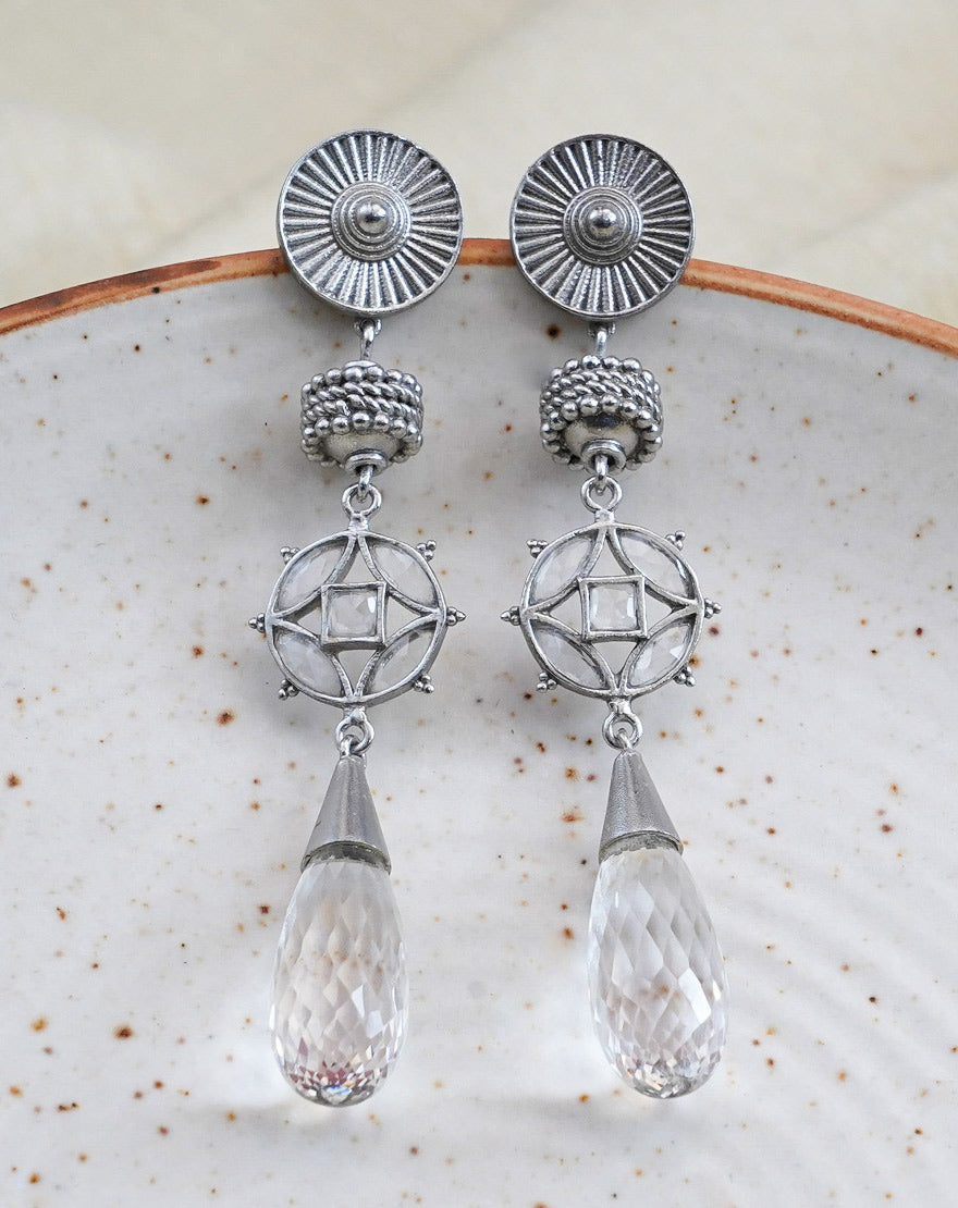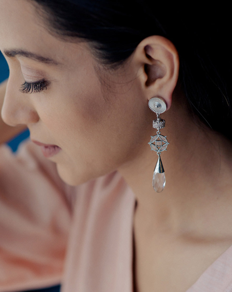 Sarah- Clear Quartz – These stunning pair of earrings are inspired from the architectural patterns found in the city of Marrakech (Morocco) handcrafted using silver plated brass with drop shaped Clear Quartz stone along with smaller sized stones. These earrings are feather light in weight and a perfect pair of Indian Contemporary style.