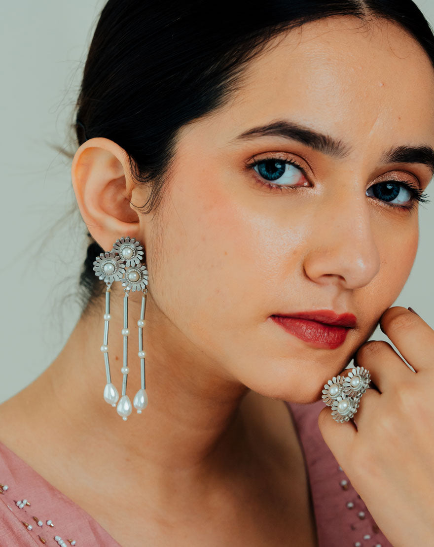 Seher Earrings are beautifully handcrafted using silver plated brass and different shapes of fresh water pearls. With stunning waterfall tassels these earrings gives drama to your look. Pair it with western or Indian outfits, these earrings will go anything and everything.