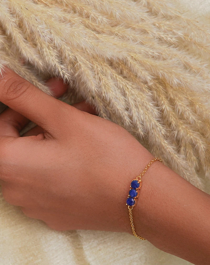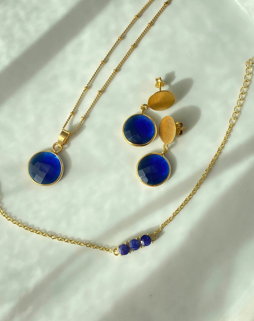 This beautiful combo of Anastasia collection of Necklace + earrings + bracelet handmade using Sapphire Hydro birthstone, 18k gold plated 925 silver which will make a perfect gift for your loved one or just for yourself.