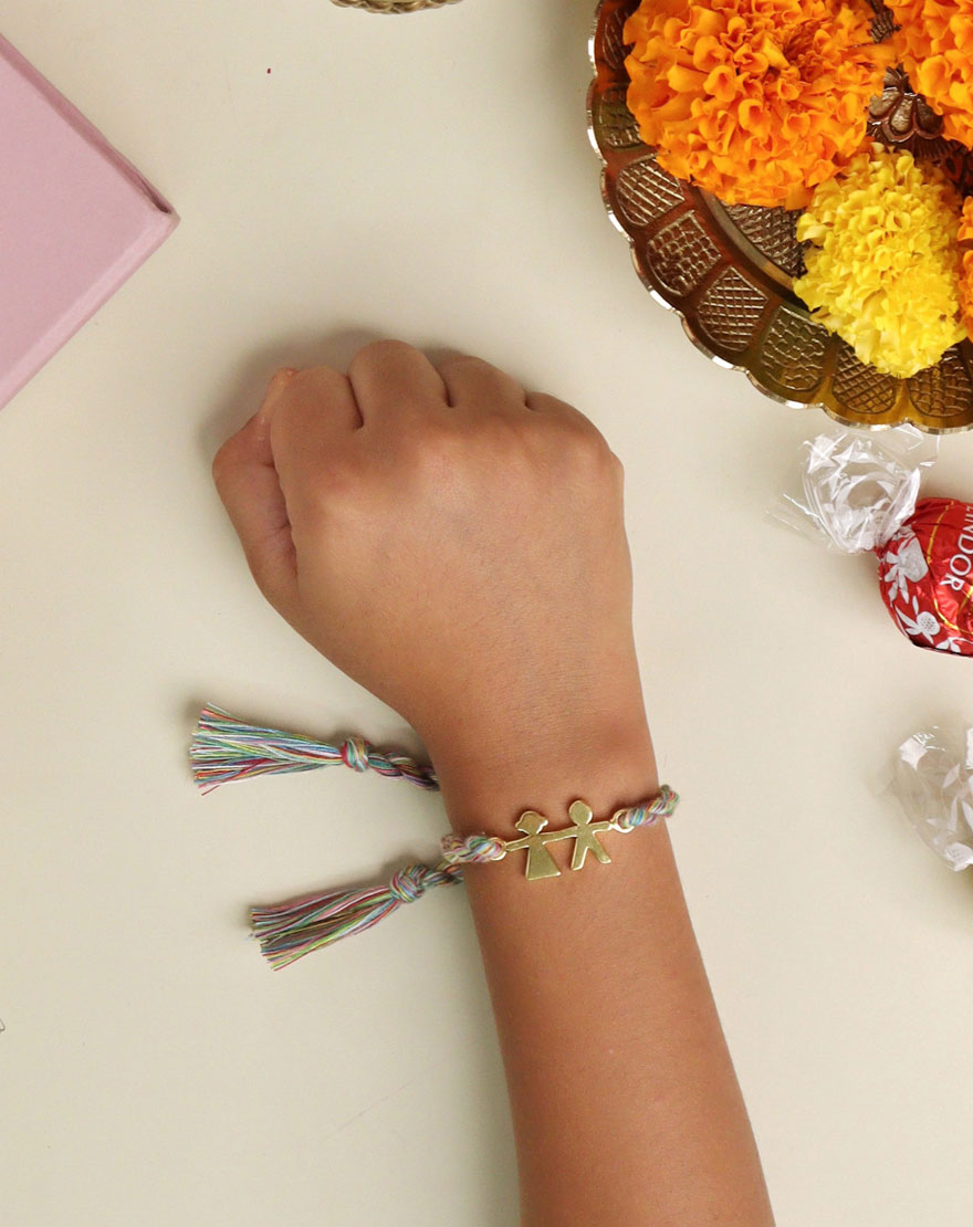 This cute rakhi is inspired from the paper doll concept. Symbolising the bond between siblings which are shown holding hands. Handcrafted using 18k gold plated brass with multi colored organic cotton thread.