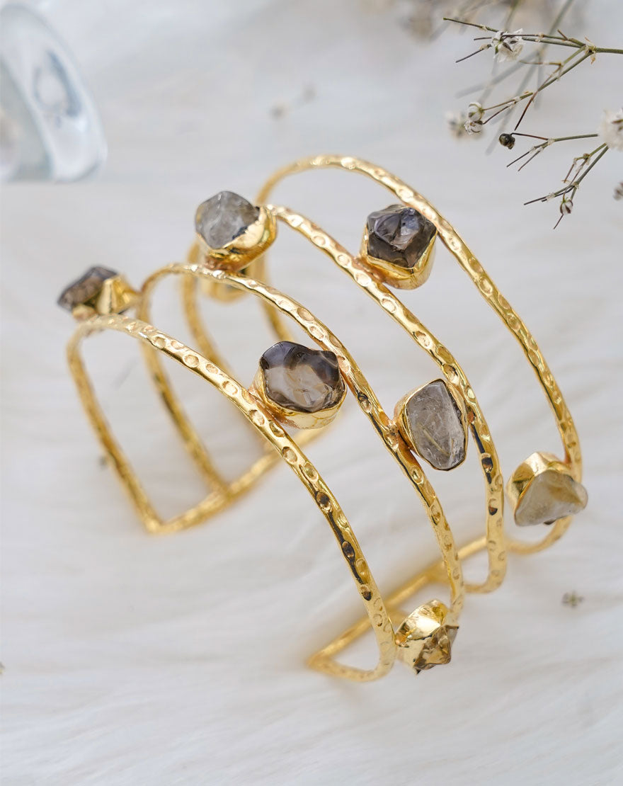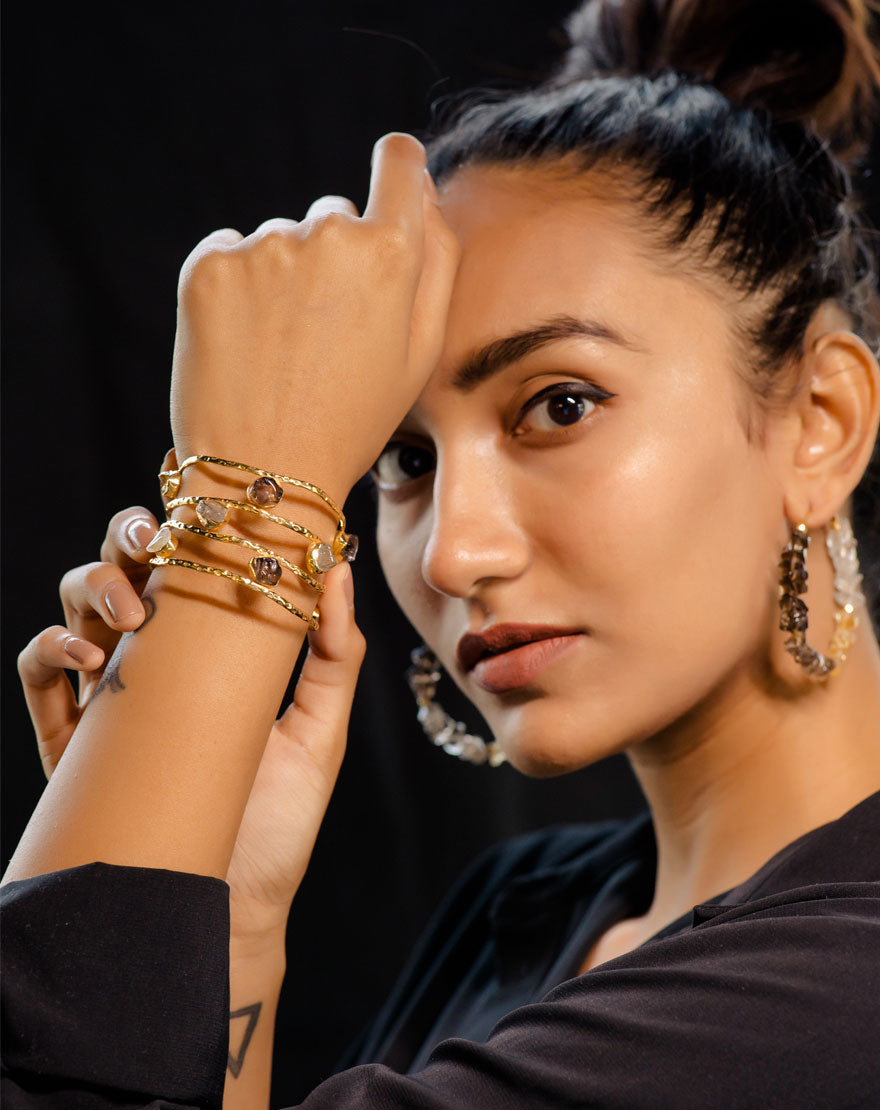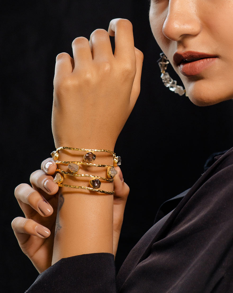 Sierra Cuff is a stunning statement making piece of bracelet, handcrafted using different shades of smokey quartz on gold plated recycled brass.