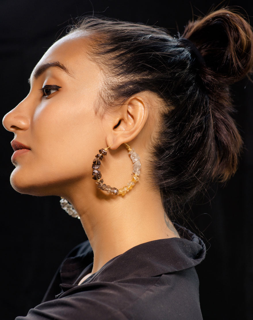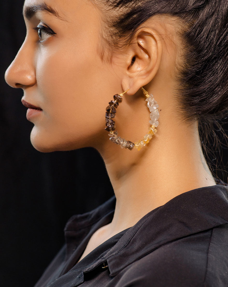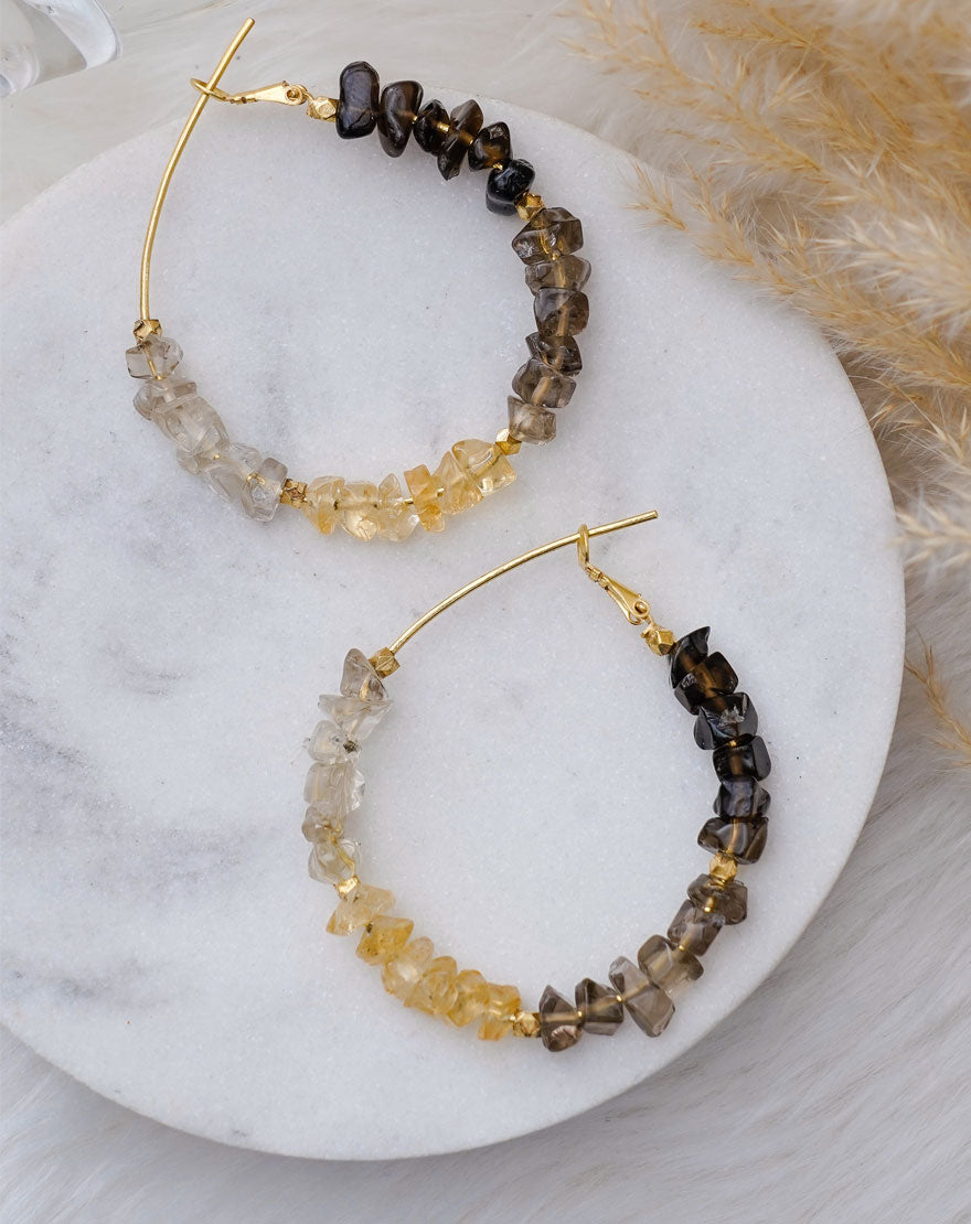 Sierra Hoops are stunning statement making earrings, handcrafted using different shades of smokey quartz on gold plated recycled brass.