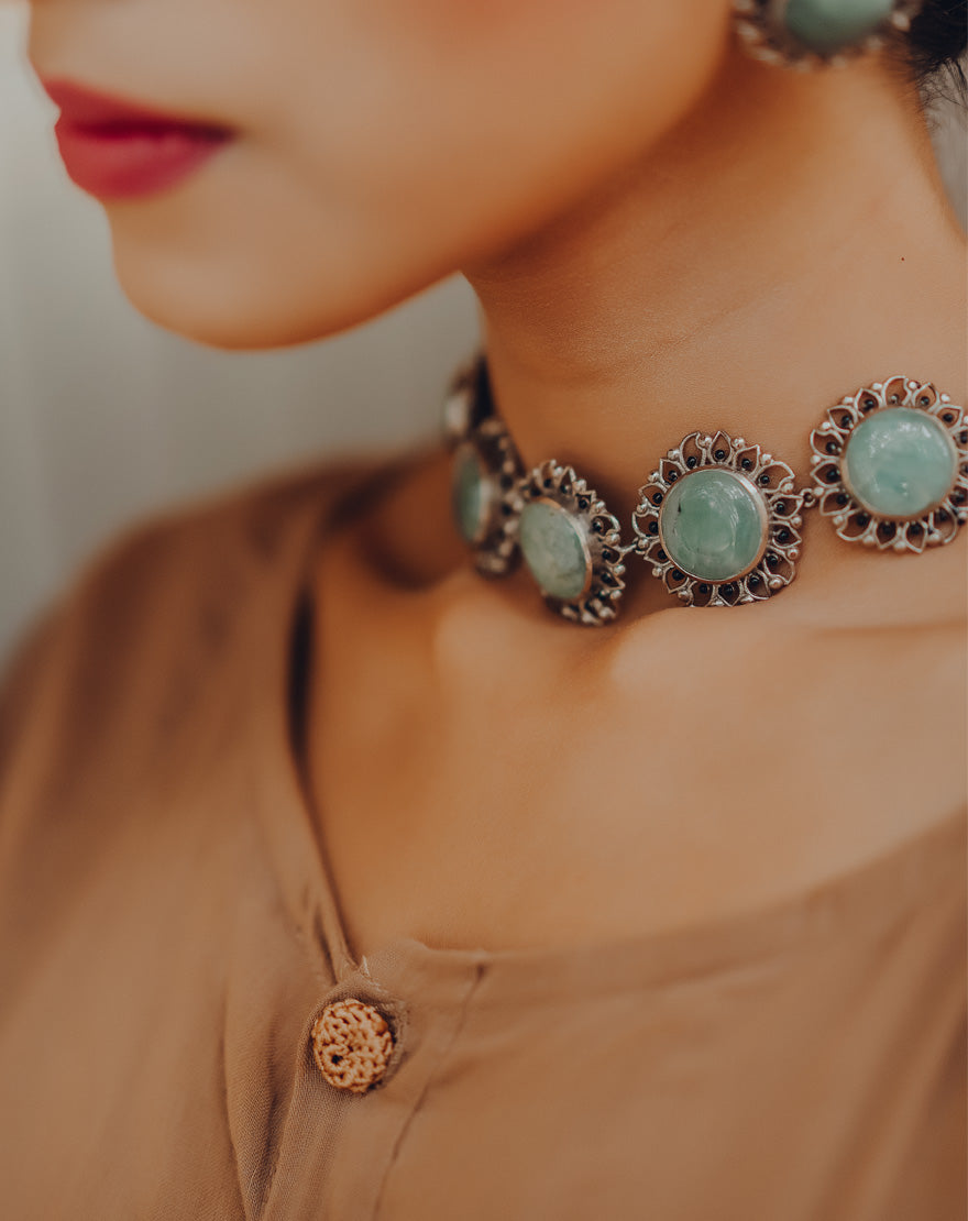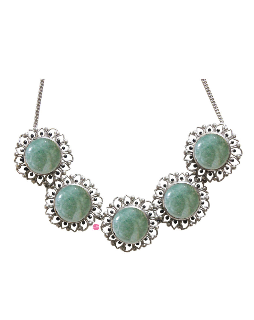 Silver Bloom Choker – Green Aventurine : Statement making choker handcrafted using finest quality of green aventurine stones set in the floral inspired motifs on silver plated brass.