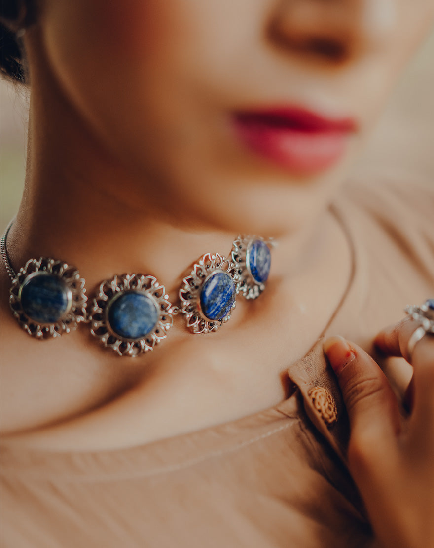 Silver Bloom Choker – Lapis Lazuli : Statement making choker handcrafted using finest quality of lapis lazuli stones set in the floral inspired motifs on silver plated brass.