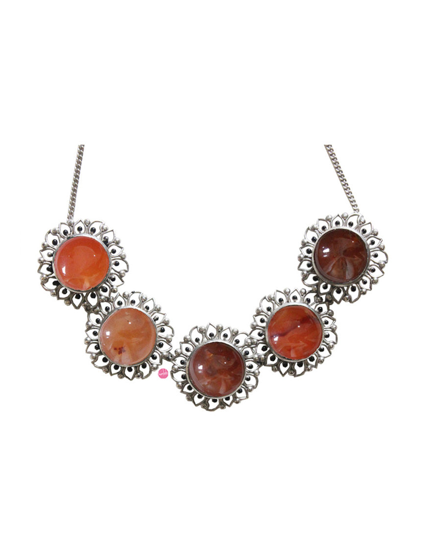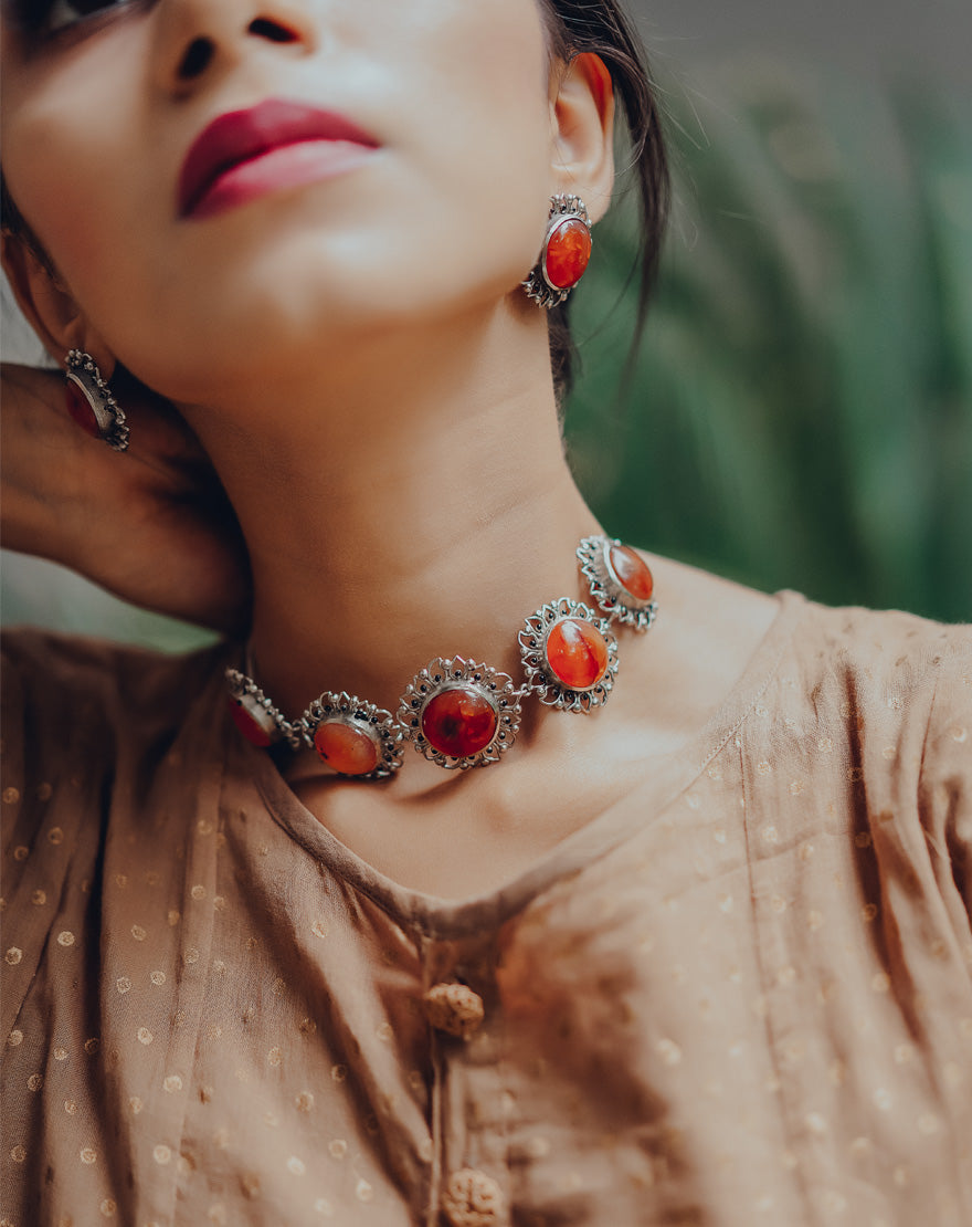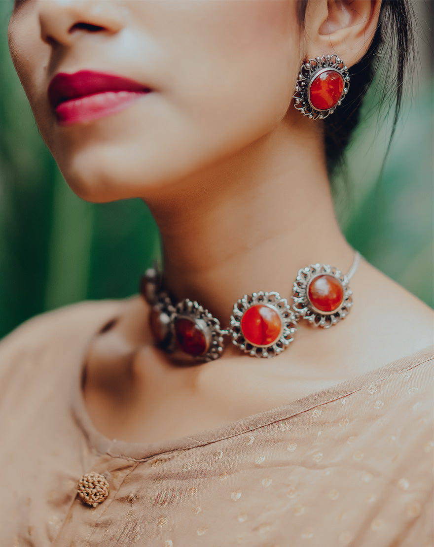 Silver Bloom Choker – Red Carnelian : Statement making choker handcrafted using finest quality of red carnelian stones set in the floral inspired motifs on silver plated brass.