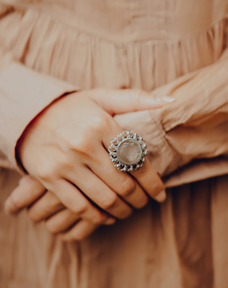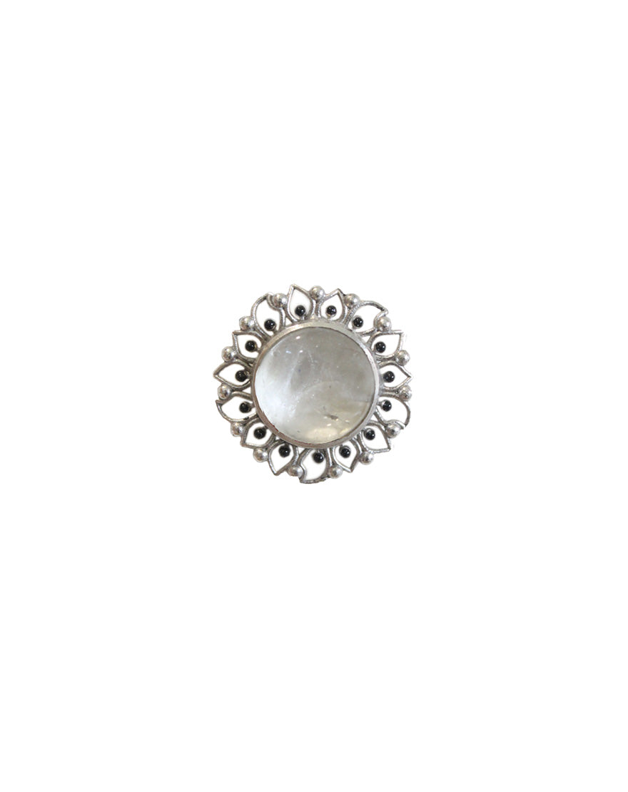 Silver Bloom Ring – Clear Quartz : Statement making ring handcrafted using lapis lazuli stone and floral inspired intricate motifs.