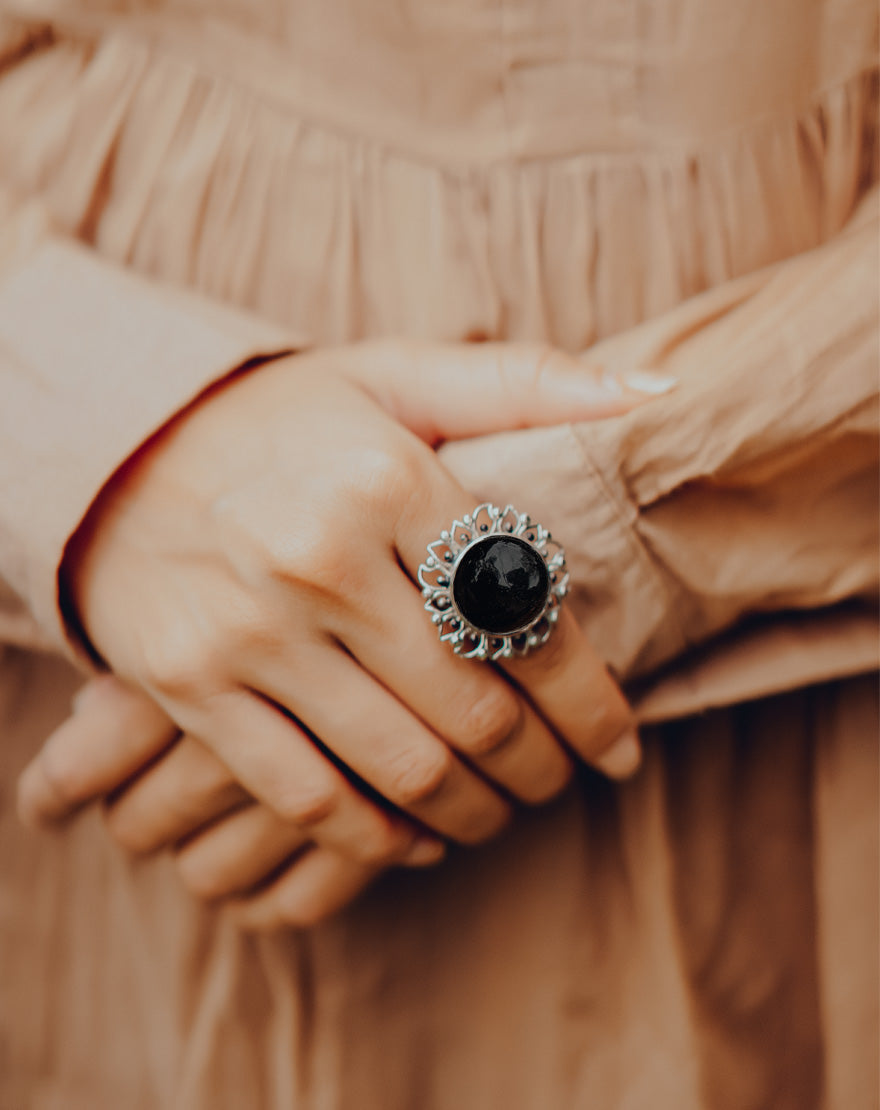 Silver Bloom Ring – Black Onyx : Statement making ring handcrafted using black onyx stone and floral inspired intricate motifs.