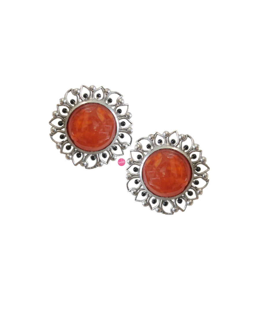 Silver Bloom Studs – Carnelian : Handcrafted studs using red carnelian stones and floral inspired motifs on silver plated brass.