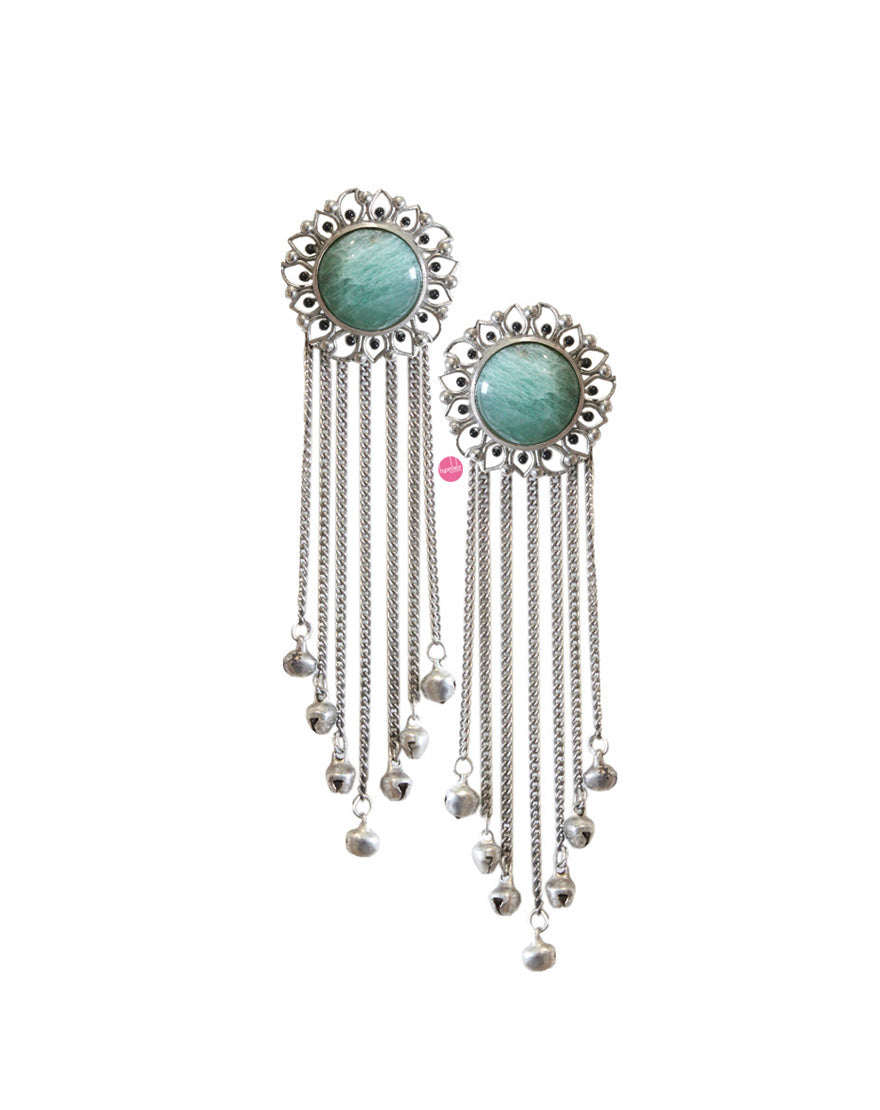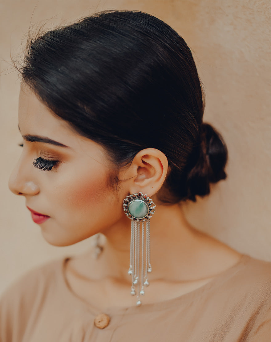 Silver Bloom Tassels – Green Aventurine : Handcrafted statement making tassels earrings made using Green Aventurine stone on silver plated metal.