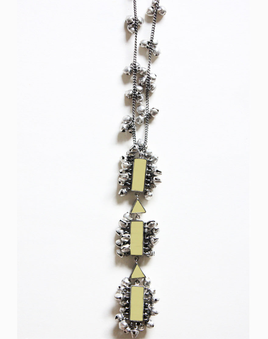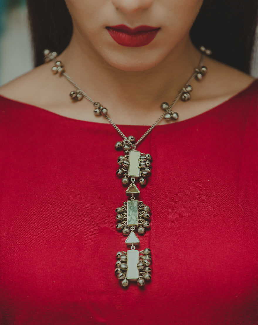 Silver Geometry Long Necklace : Statement making necklace handcrafted using silver plated metal with mirrors and ghunghroos.