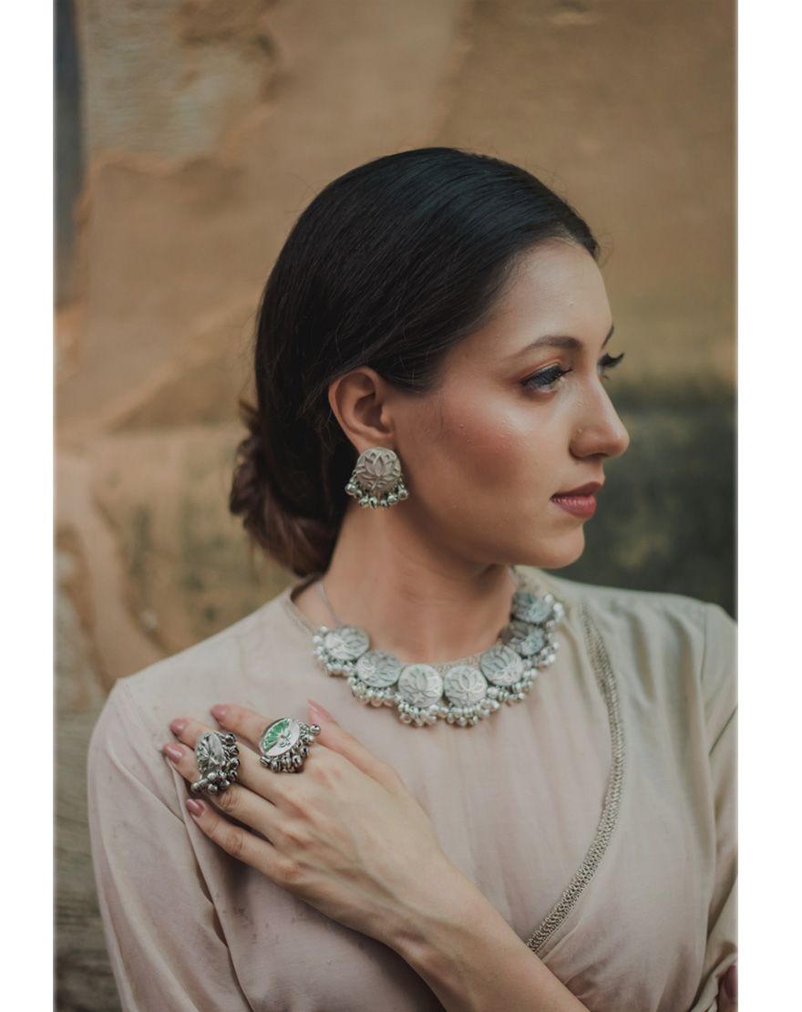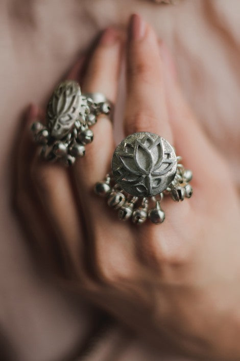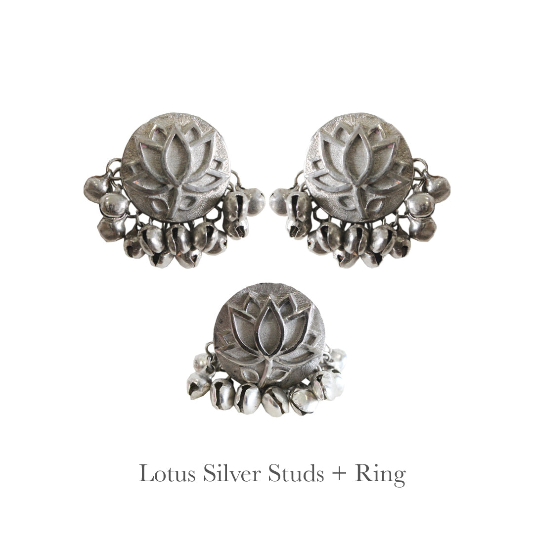 Silver Lotus Studs + Ring Combo : Handcrafted silver lotus studs with picchwai motifs and ghunghroos with silver lotus ring, buy as a combo and get at discounted price.