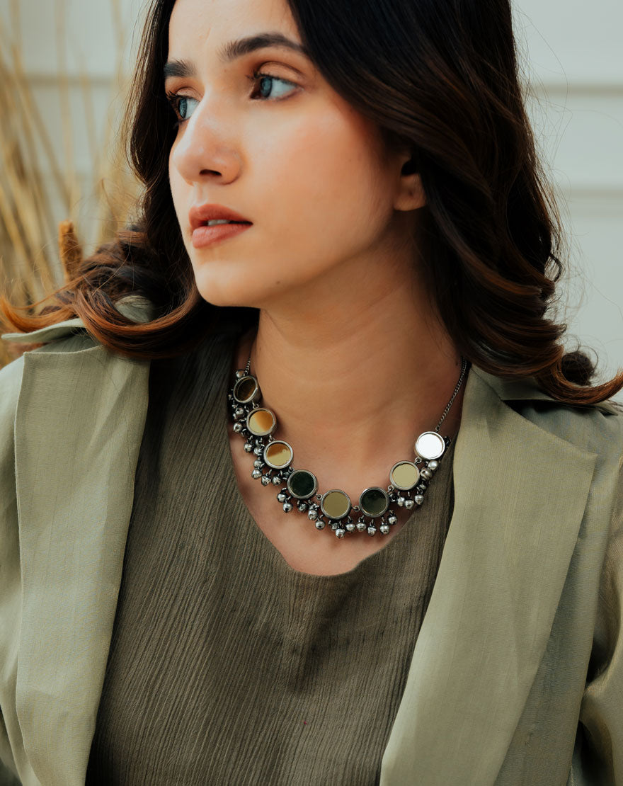 Silver Moon Choker : Statement making necklace handcrafted using silver plated metal with tinted mirrors and ghunghroos.