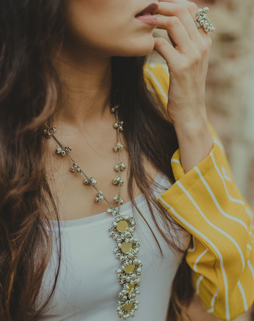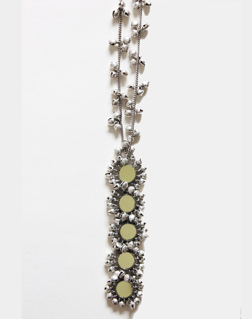 Silver Moon Long Necklace : Statement making necklace handcrafted using silver plated metal with mirrors and ghunghroos.