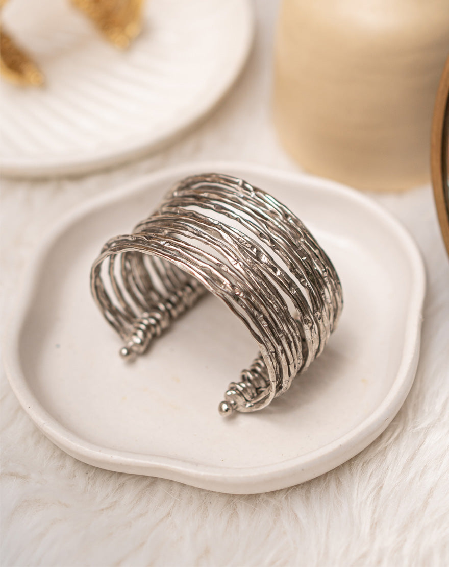 This stunning statement making cuff bracelet is handcrafted using silver plated recycled brass. Each and every wire of the cuff has a beautiful texture which is completely hand done. This cuff will elevate your look completely and is super versatile.