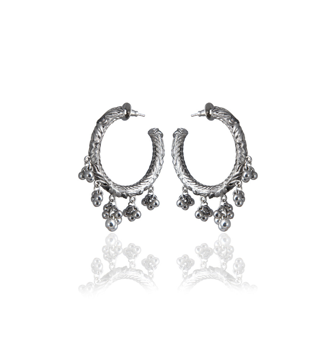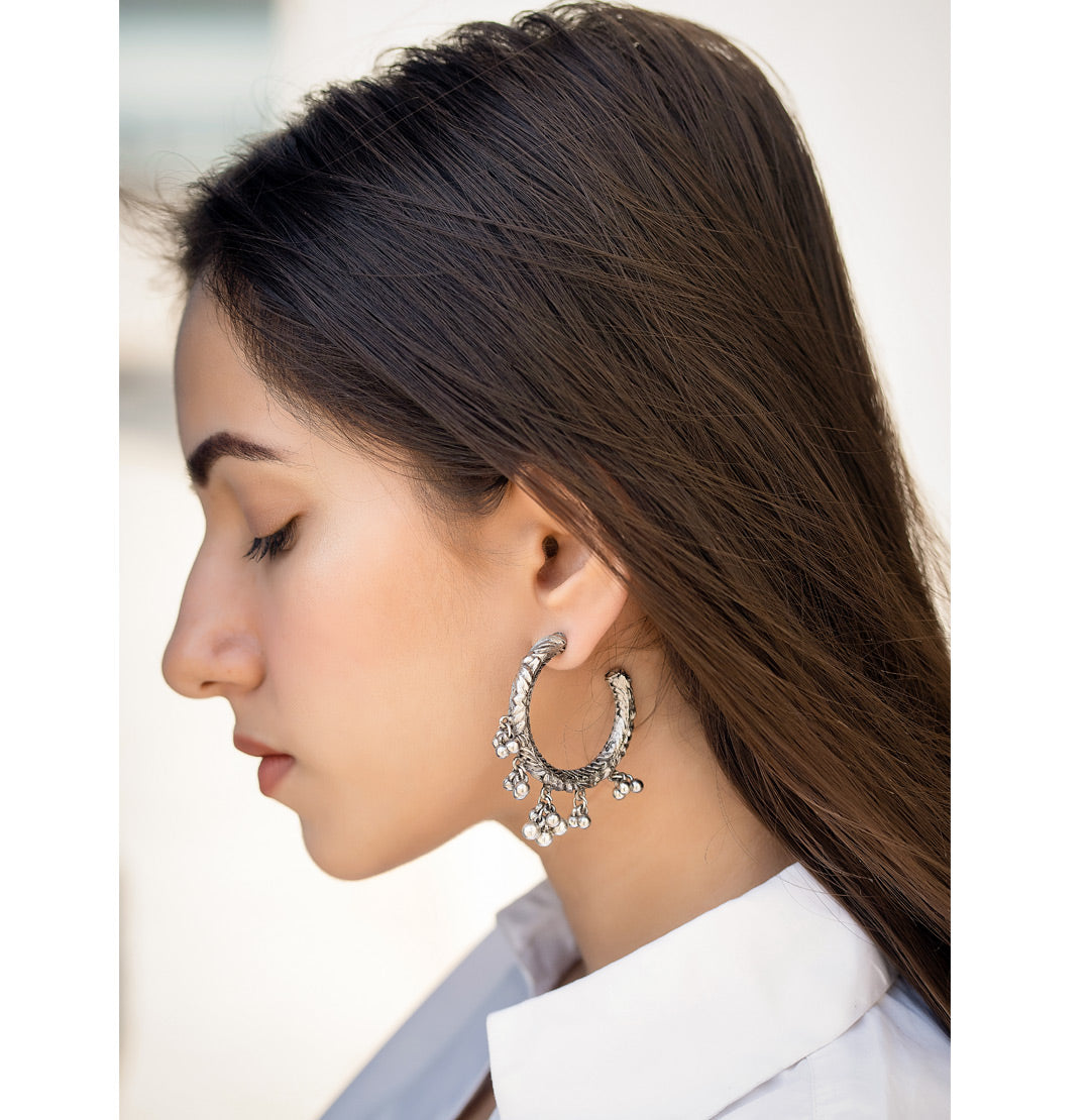 Silver Traditional Hoops (small) : Reviving the old traditional form of tribal jewelry, handcrafted silver plated hoops with Indian motifs carving and ghunghroos. Statement making hoops for all looks