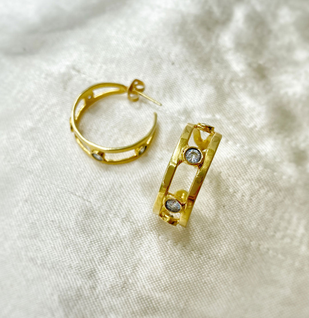 Silvia Hoops Crystal Mini – Beautiful handcrafted mini hoops with studded cz stones on 18k gold plated brass. A perfect mini but bold hoops from work wear to dinner wear.