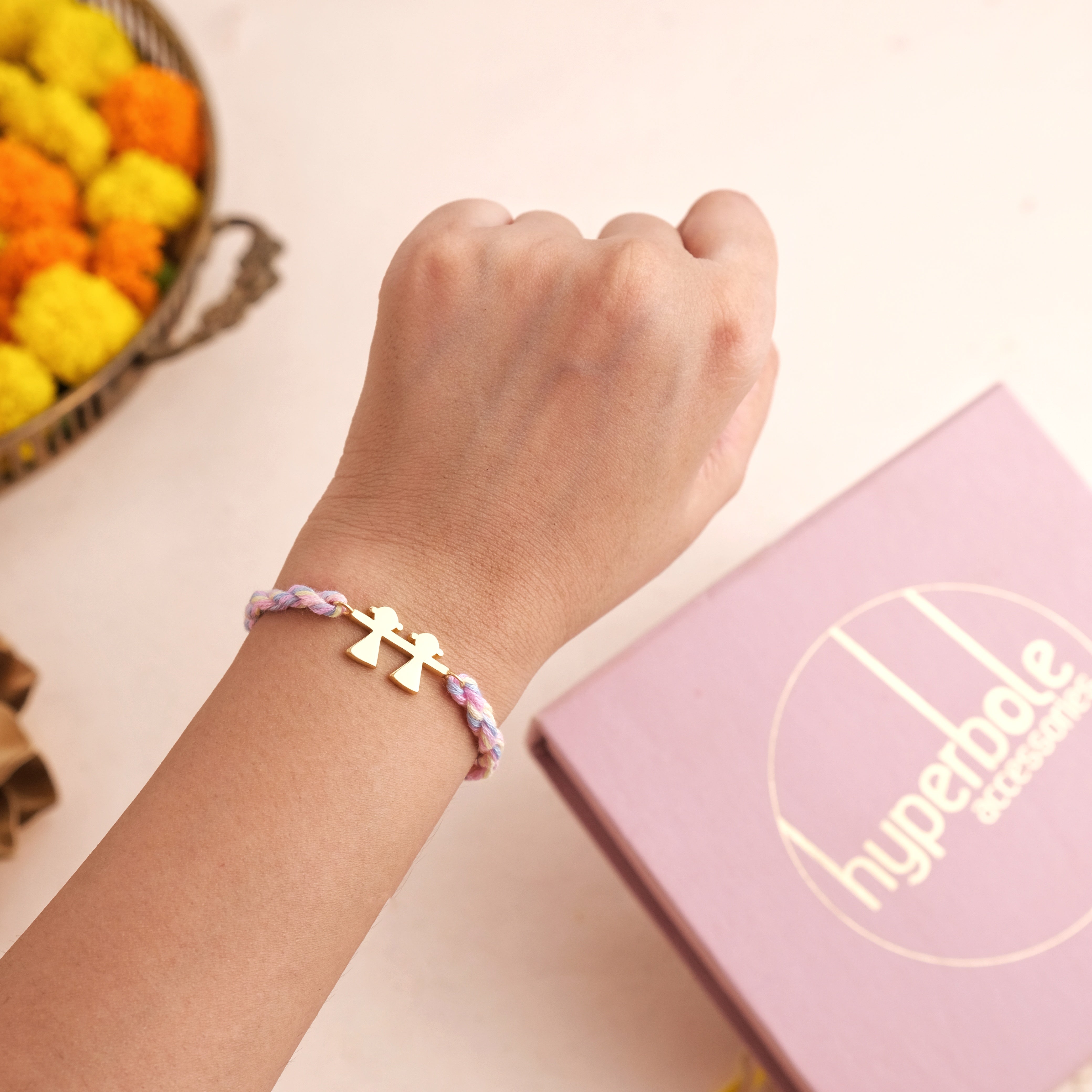 Celebrate the unbreakable bond between sisters with our charming Sisterhood Rakhi, inspired by the timeless paper doll concept. The centerpiece features delicate figures holding hands, symbolizing the strength and unity of sisterhood.
