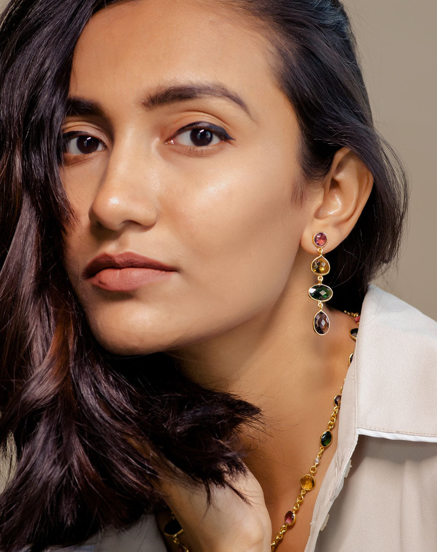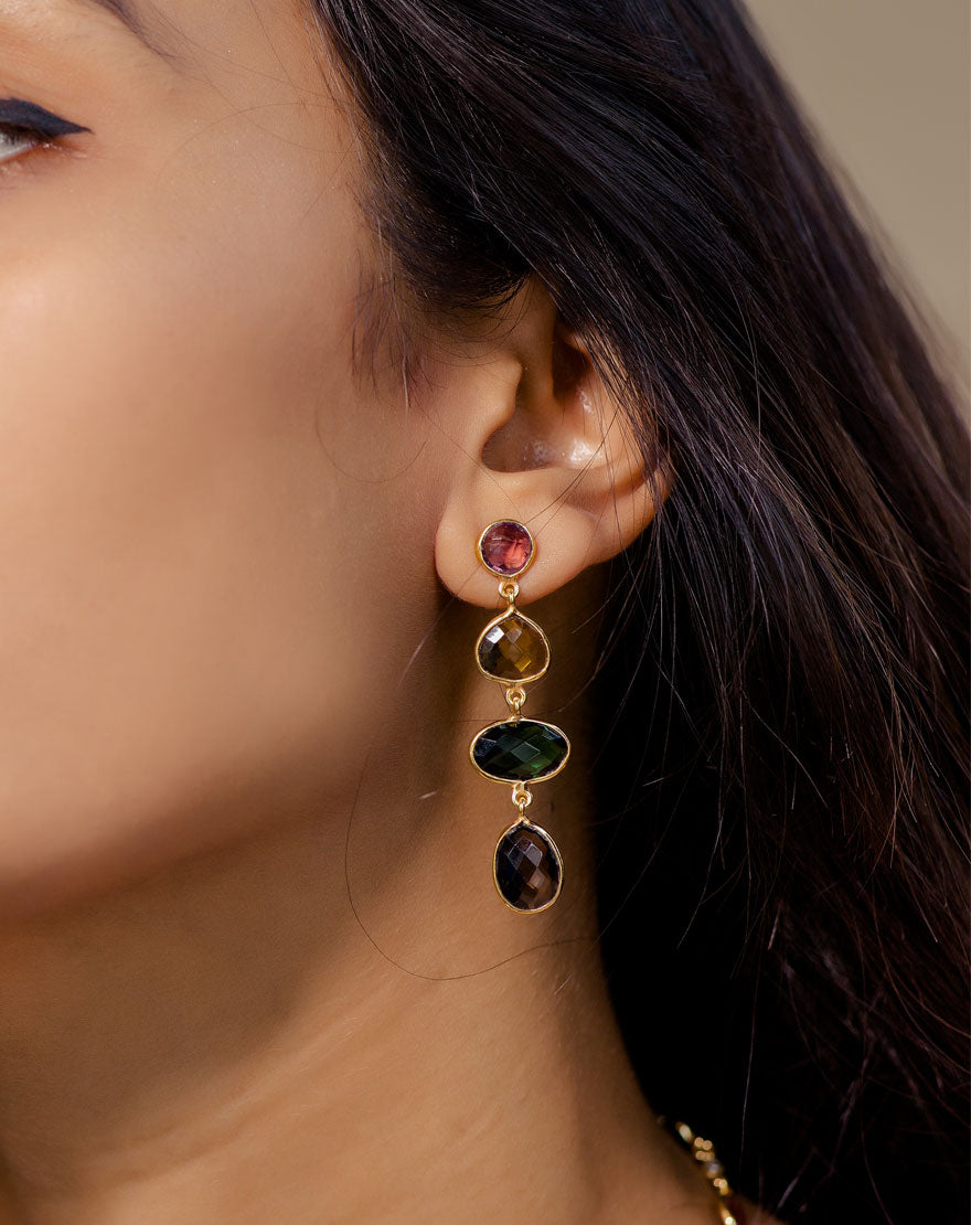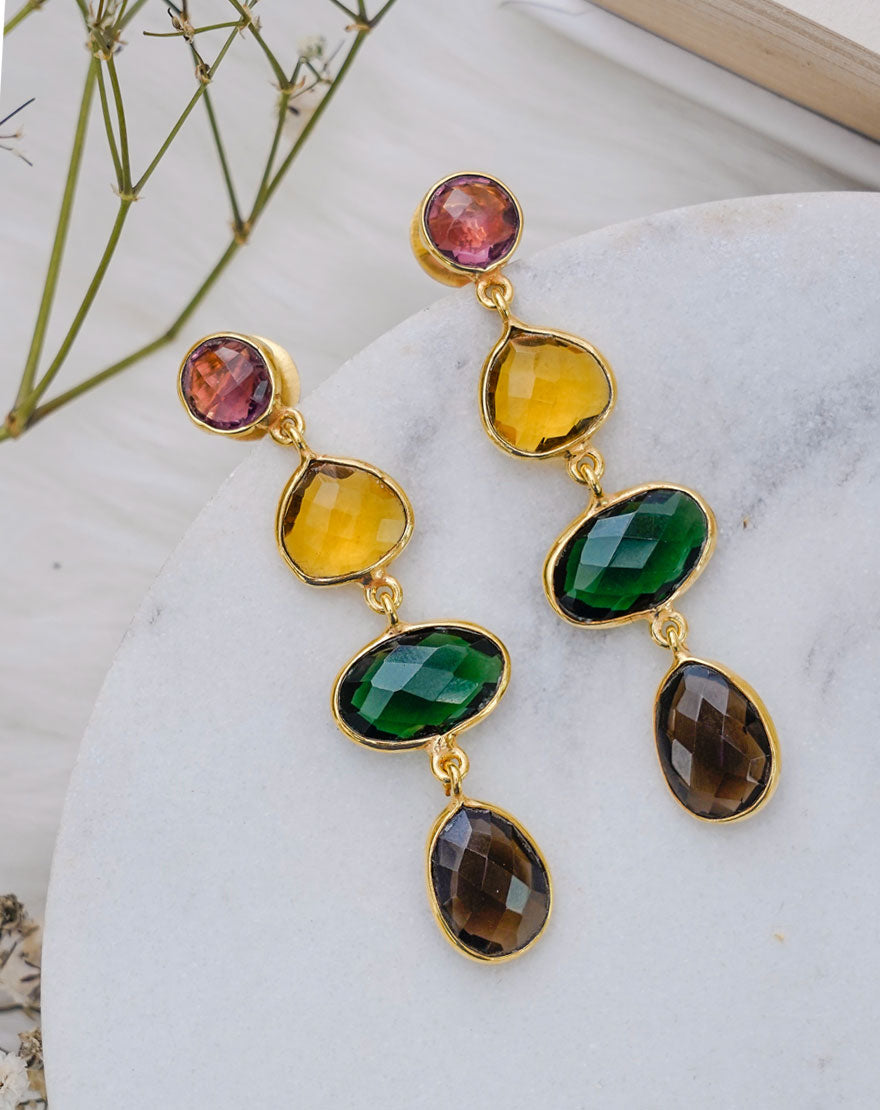 These beautiful multicolored earrings a perfect to elevate your simple look. Handcrafted using recycled brass on 18k gold plating with beautiful semi precious stones. These earrings are a statement in itself.
