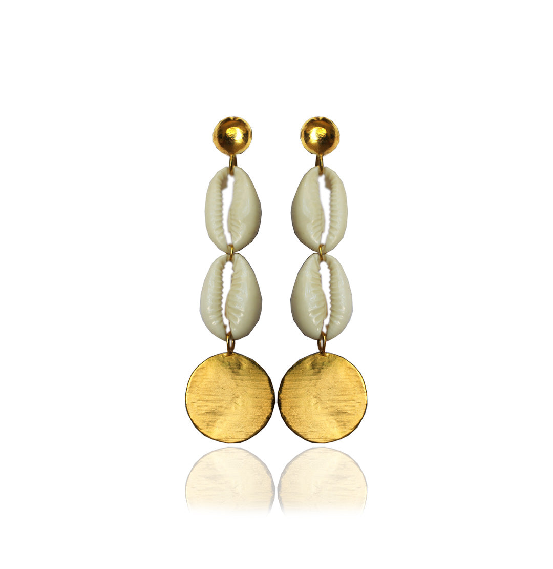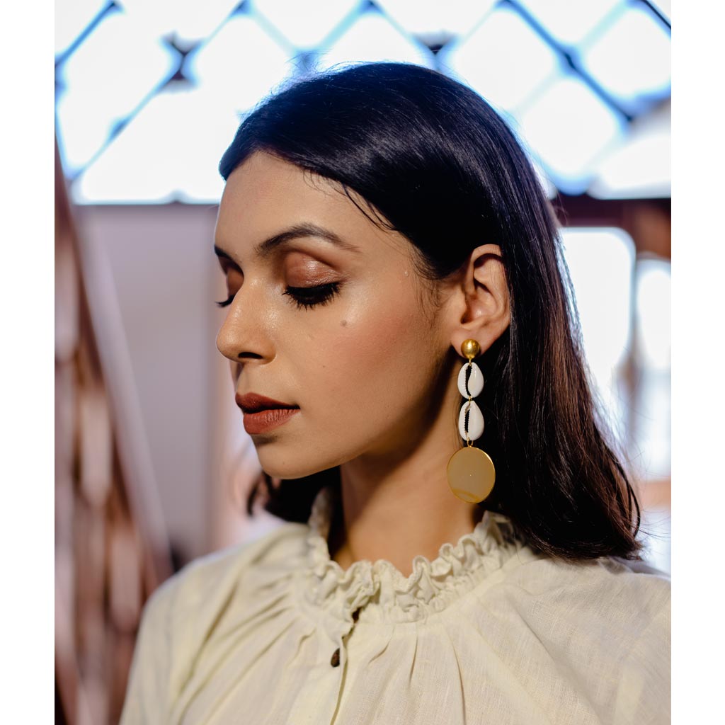 Summer Shell Disc Danglers : Handcrafted summery danglers, made using cowrie shells on 1 micron gold plated brass. A perfect breezy pair of earrings for your beach vacation.