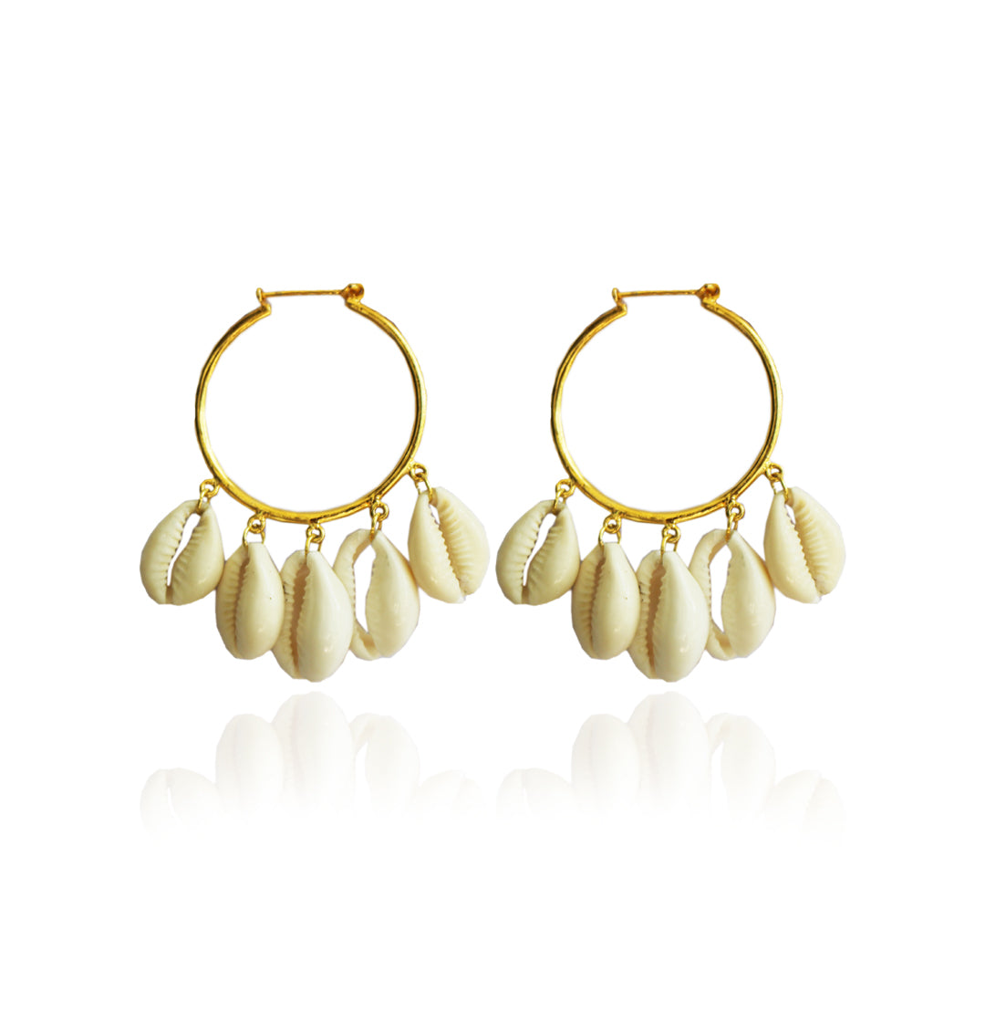 Summer Shell Hoops : Handcrafted summery hoops, made using cowrie shells on 2 micron gold plated brass. A perfect breezy pair of hoops for your beach vacation.