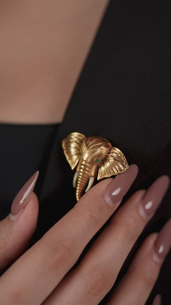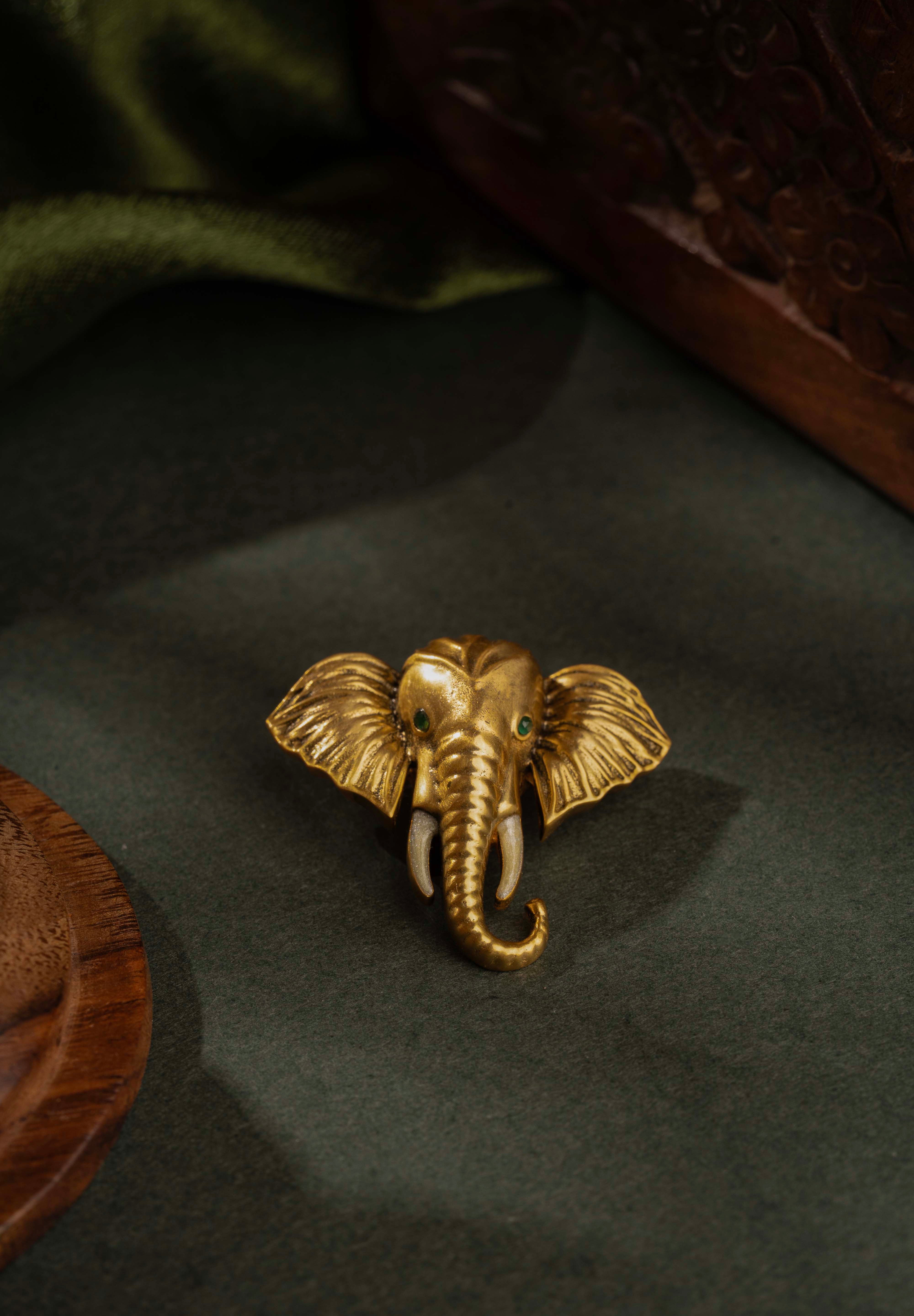 Exclusively designed by founder Gazal Kothari, this piece is crafted in recycled brass, dipped in 18k gold, and finished with a rich antique patina for heirloom character. The eyes are studded with deep green emeralds, while the tusks are delicately hand-painted in ivory enamel, adding dimension and artistry to the sculpted form.