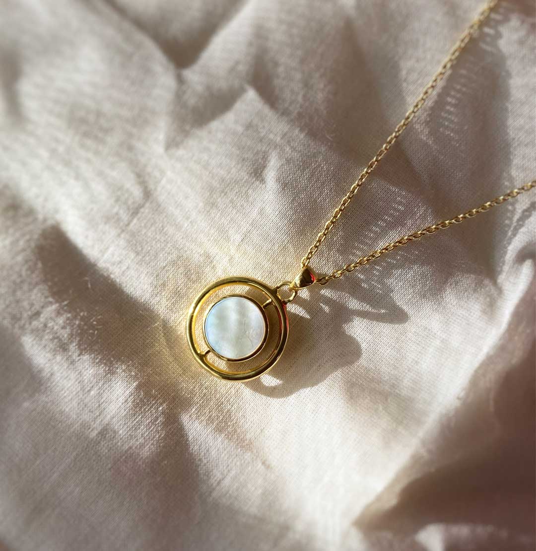 This beautiful turner necklace is a must have for your wardrobe its a 2 in 1 necklace where you can flip the stone according to your mood, we have two stones in the turner necklace white mother of pearl and black onyx.