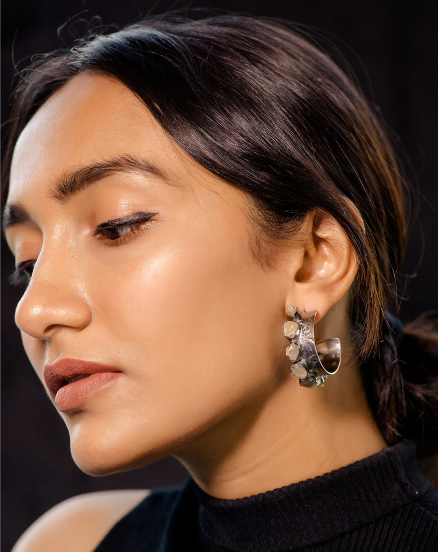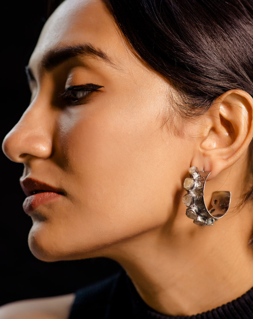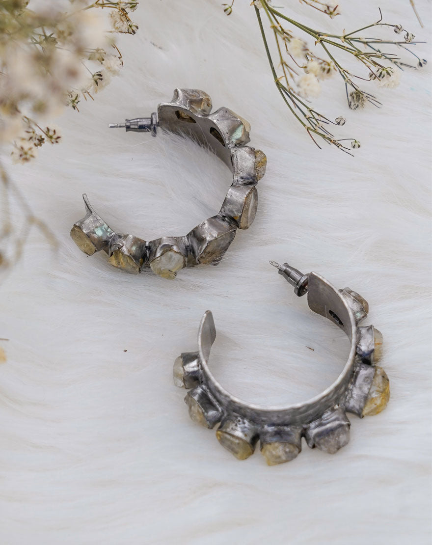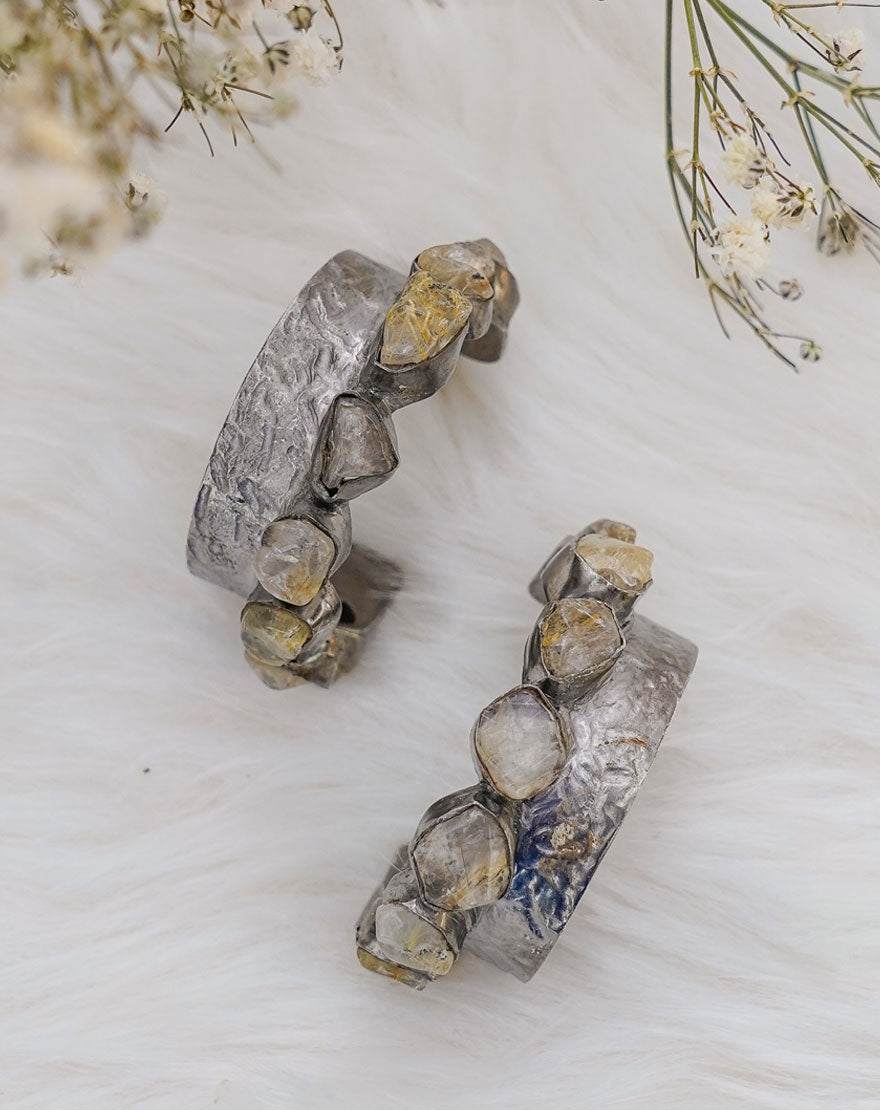 Valeria means “strength” these statement making fierce hoops are a perfect pair of bold earrings handcrafted using recycled brass with gunmetal plating and studded with Rutilated Quartz stone.