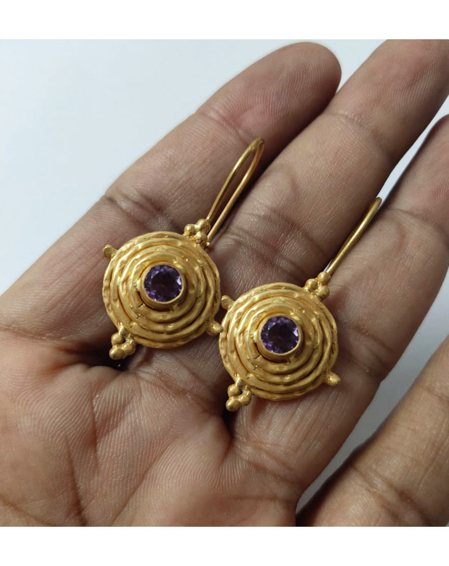 These stunning antique amethyst earrings are as seen in the movie Hocus Pocus 2 on Bette Midler who plays Winifred Sanderson in the movie. These earrings were inspired from the original Hocus Pocus movie which was released in 1993. These earrings are handcrafted using 18k gold plated recycled brass with an antique gold finish and a beautiful 6mm Amethyst stone in the center.