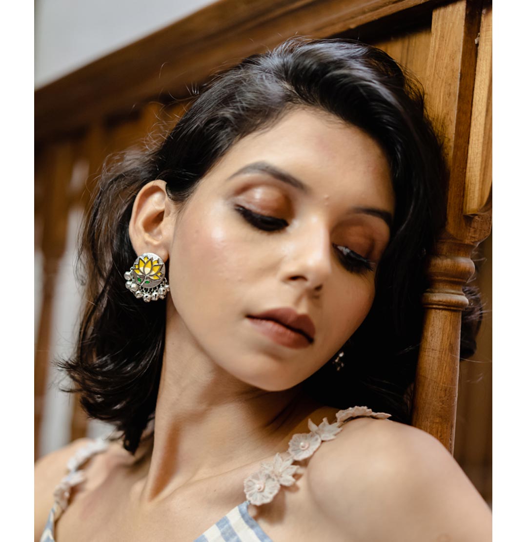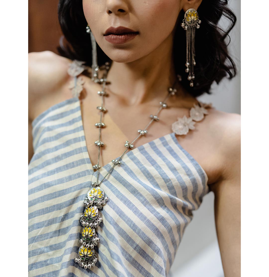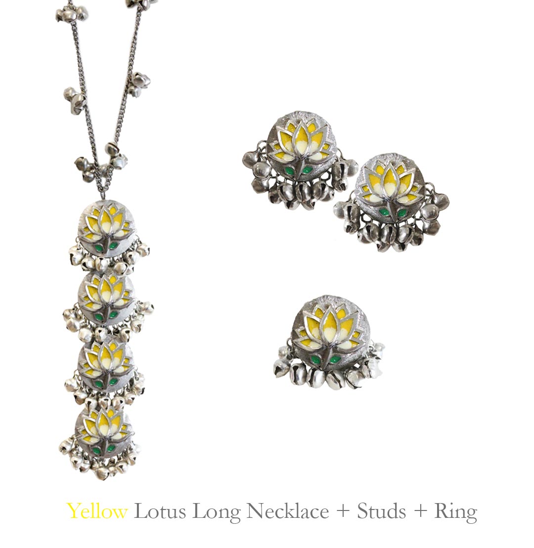 Yellow Long Lotus Necklace + Studs and Ring Combo – Handcrafted silver lotus studs with picchwai motifs, hand painted enamel and ghunghroos with yellow lotus silver ring and a long necklace, buy as a combo and get at discounted price.