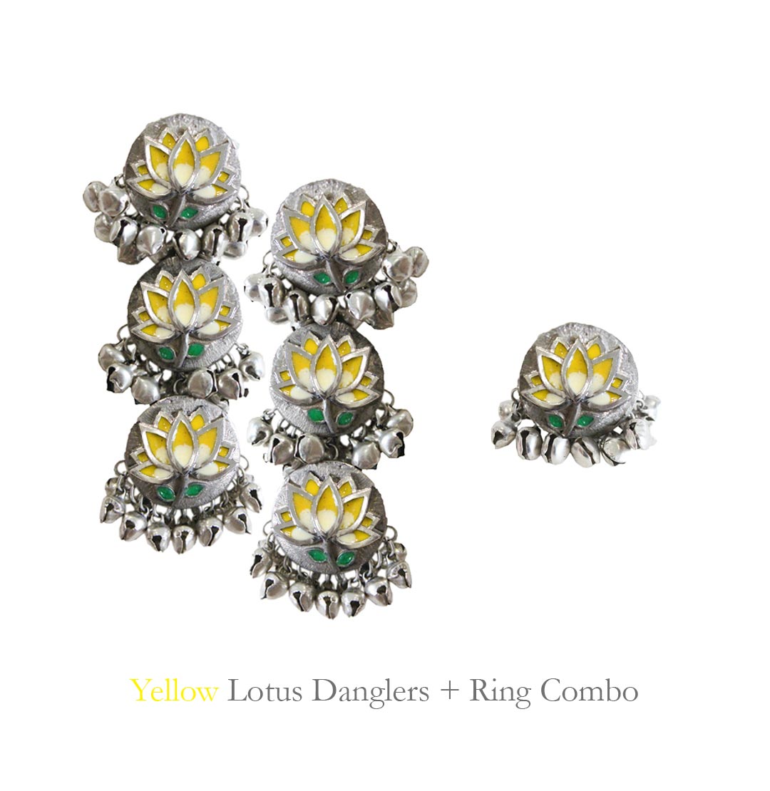 Yellow Lotus Danglers and Ring Combo : Handcrafted yellow silver lotus danglers with picchwai motifs and ghunghroos, hand painted enamel and yellow silver lotus ring, buy as a combo and get at discounted price.