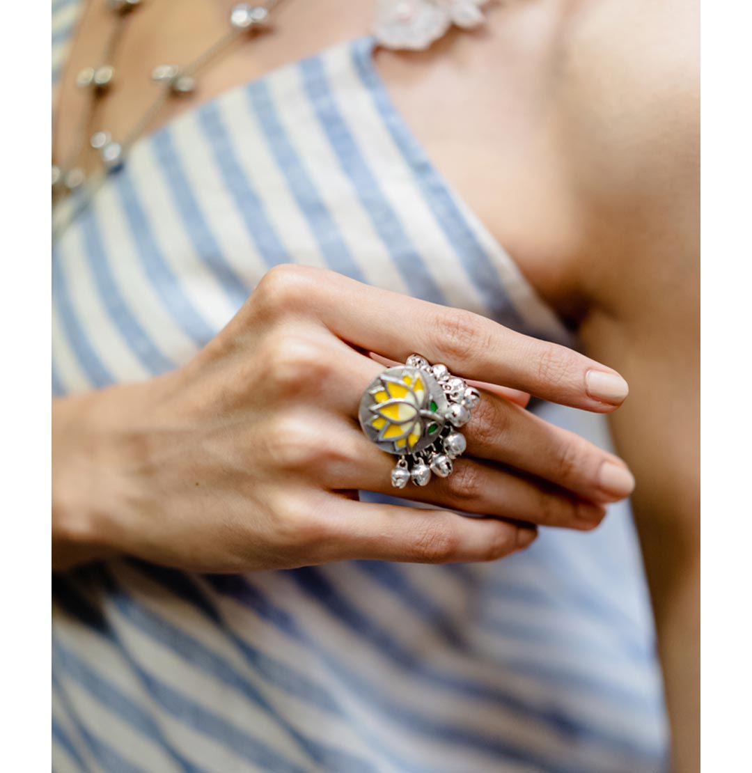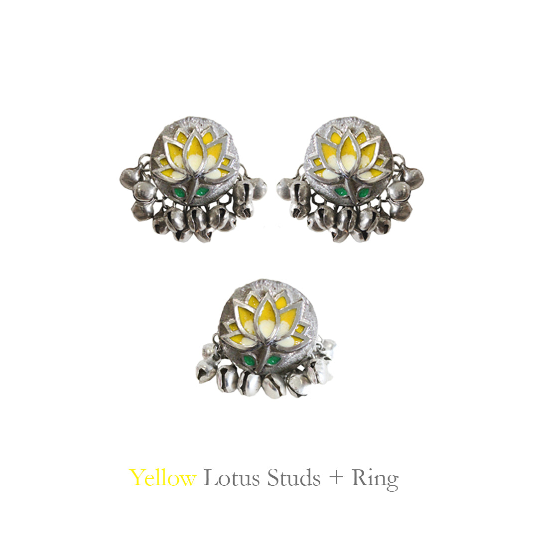 Yellow Lotus Silver Studs + Ring Combo : Handcrafted yellow silver lotus studs with picchwai motifs, hand painted enamel and ghunghroos with yellow lotus silver ring, buy as a combo and get at discounted price.