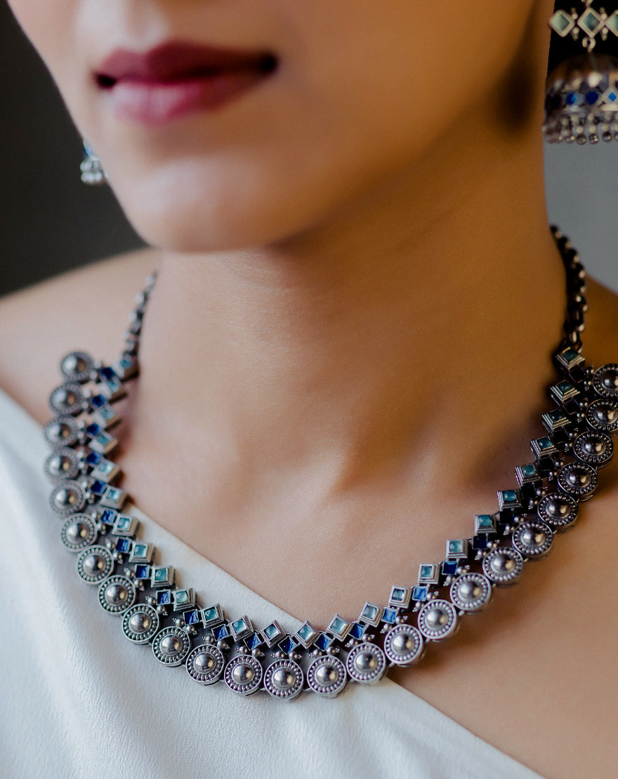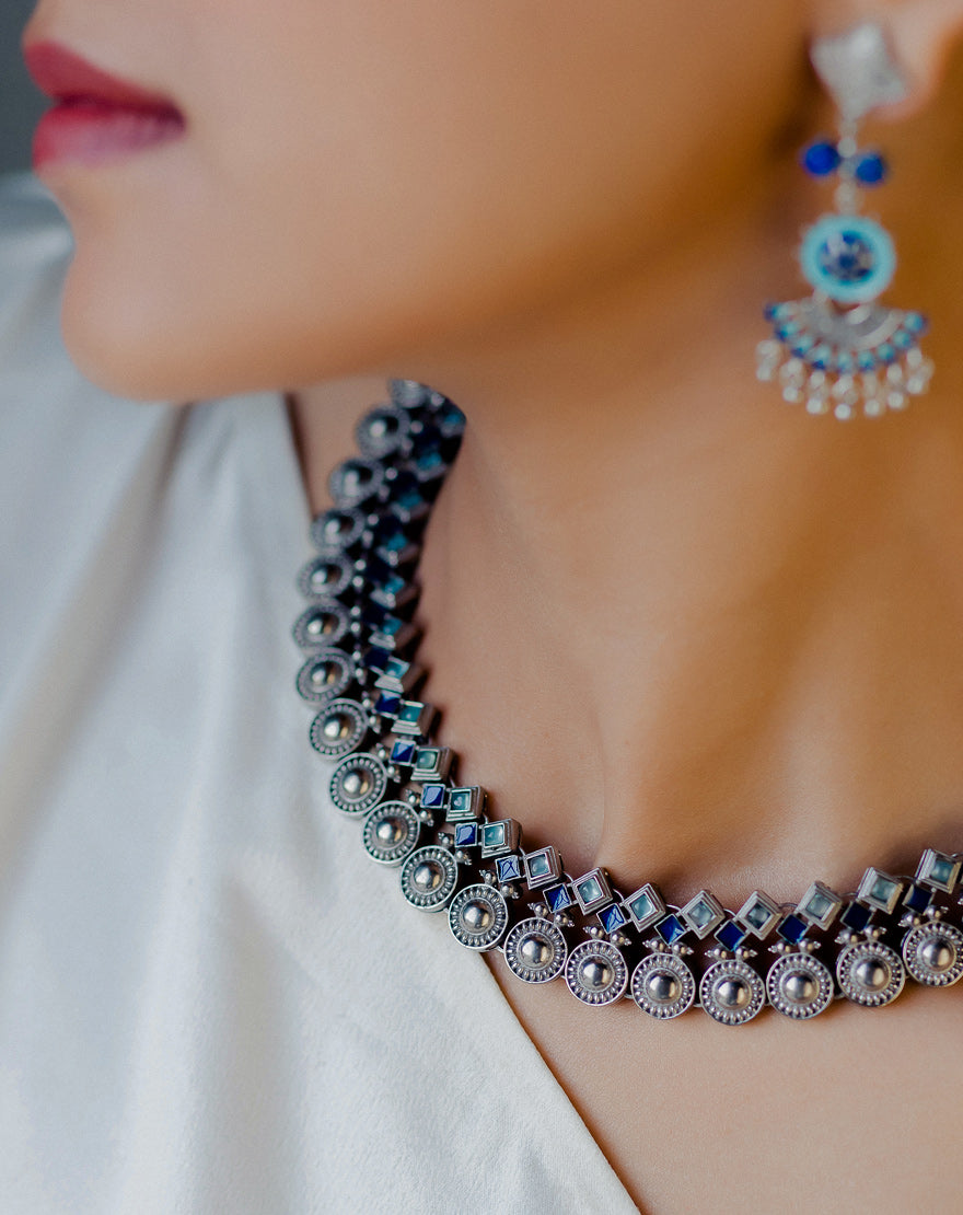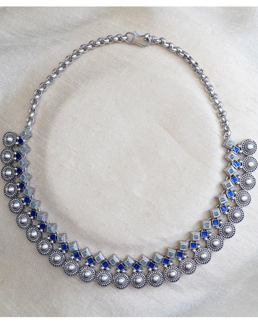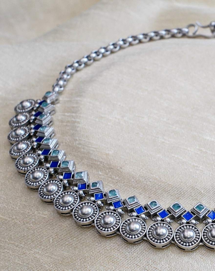 Zara Choker Blue Aqua Chalcedony – This stunning statement making choker necklace is inspired from the architectural patterns found in the city of Marrakech (Morocco) handcrafted using silver plated brass with lapis blue enamel and Aqua Chalcedony stones. This is beautiful choker has so many detailed elements which all together will be must have choker in your jewelry box.