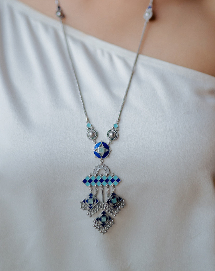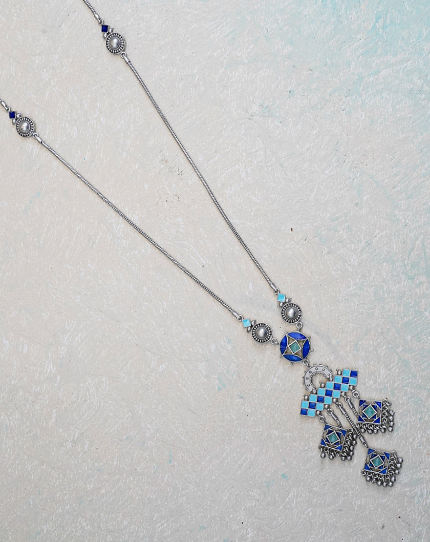 Zeba Long Necklace Blue – This beautiful necklace is inspired from the architectural patterns found in the city of Marrakech (Morocco) handcrafted using silver plated brass with sky blue and lapis blue enamel with Aqua Chalcedony stones. This necklace is 25 inches long and you can pair it up with all of your dresses.