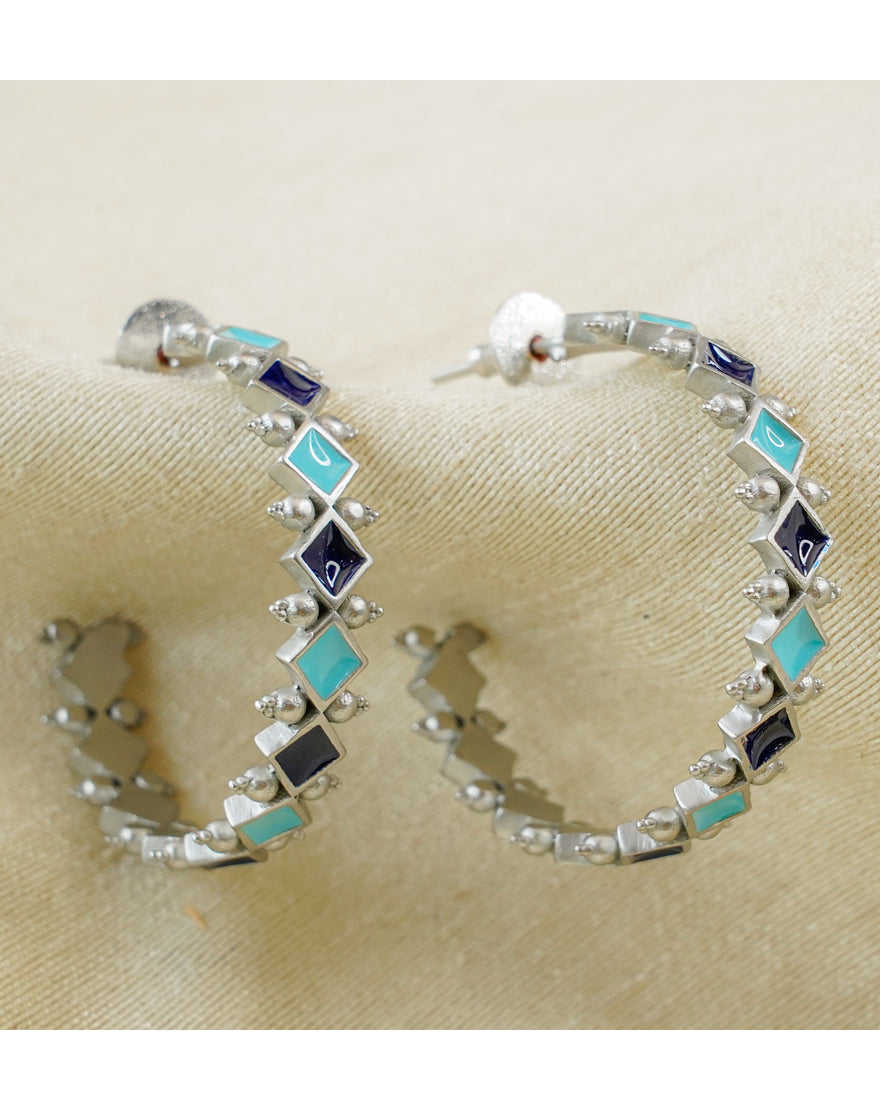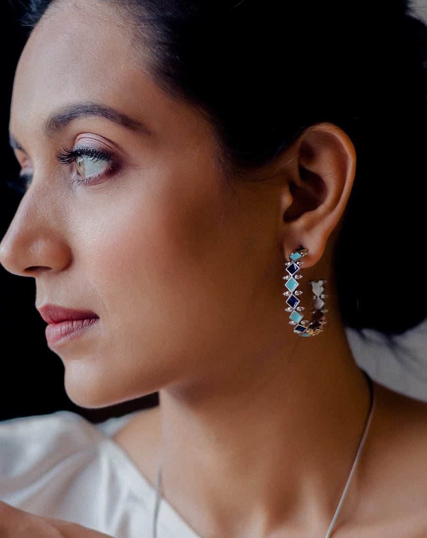 Zoya Hoops Blue – These stunning pair of Hoop earrings are inspired from the architectural patterns found in the city of Marrakech (Morocco) handcrafted using silver plated brass with sky blue and lapis blue enamel. These earrings are feather light in weight and a perfect pair of Indian Contemporary style.